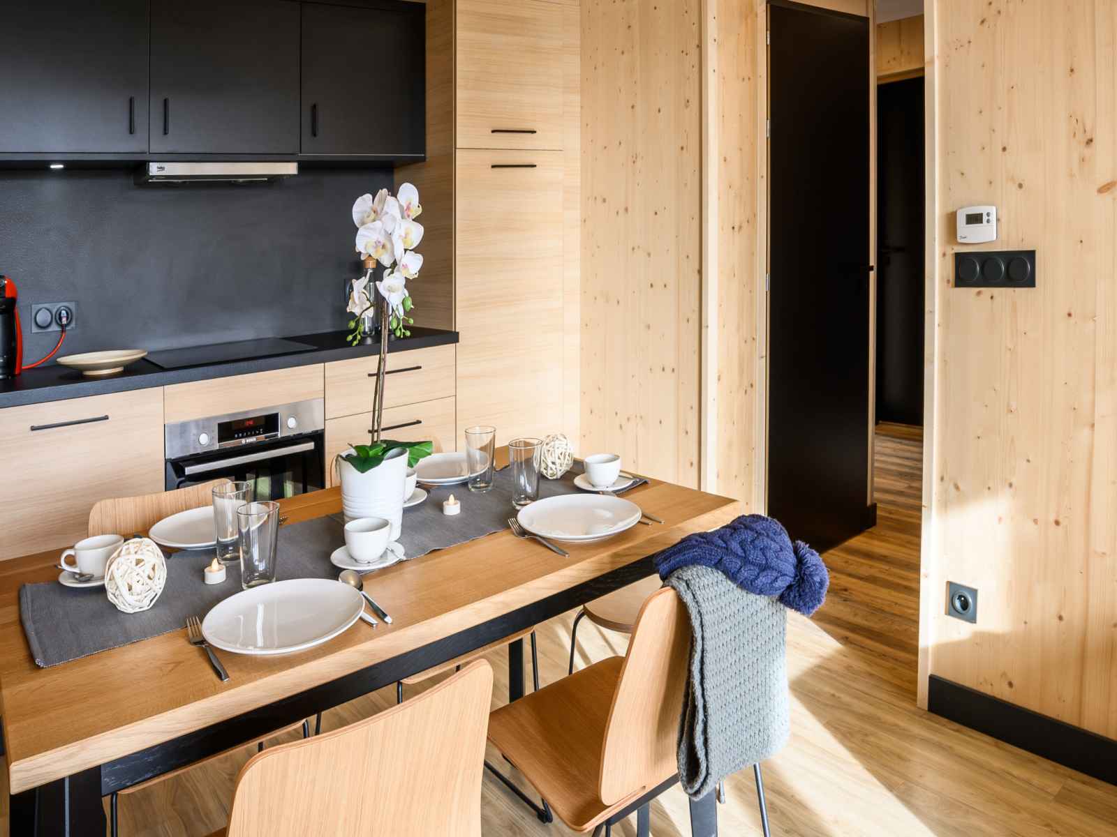 Cuisine ouverte avec un espace repas avec table à manger et chaises