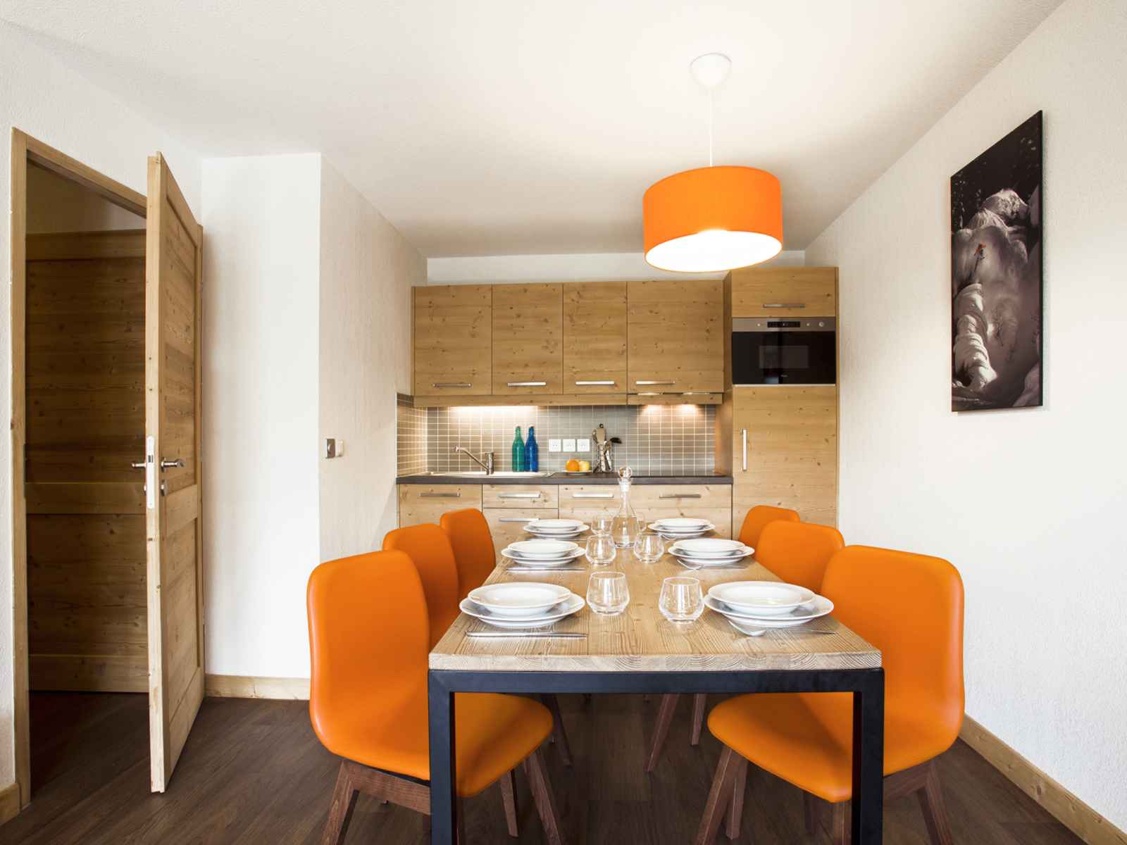 Cuisine ouverte avec espace repas avec table à manger et chaises