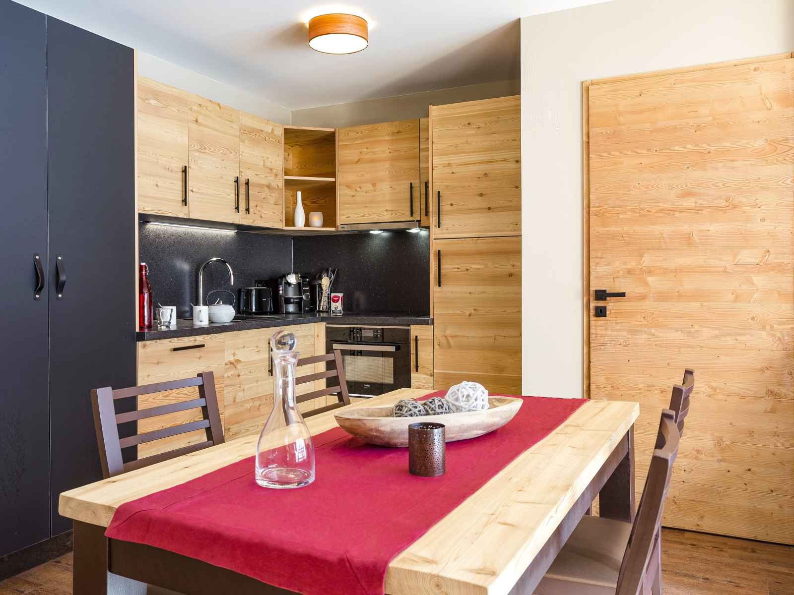 Cuisine ouverte avec un espace repas avec table à manger et chaises