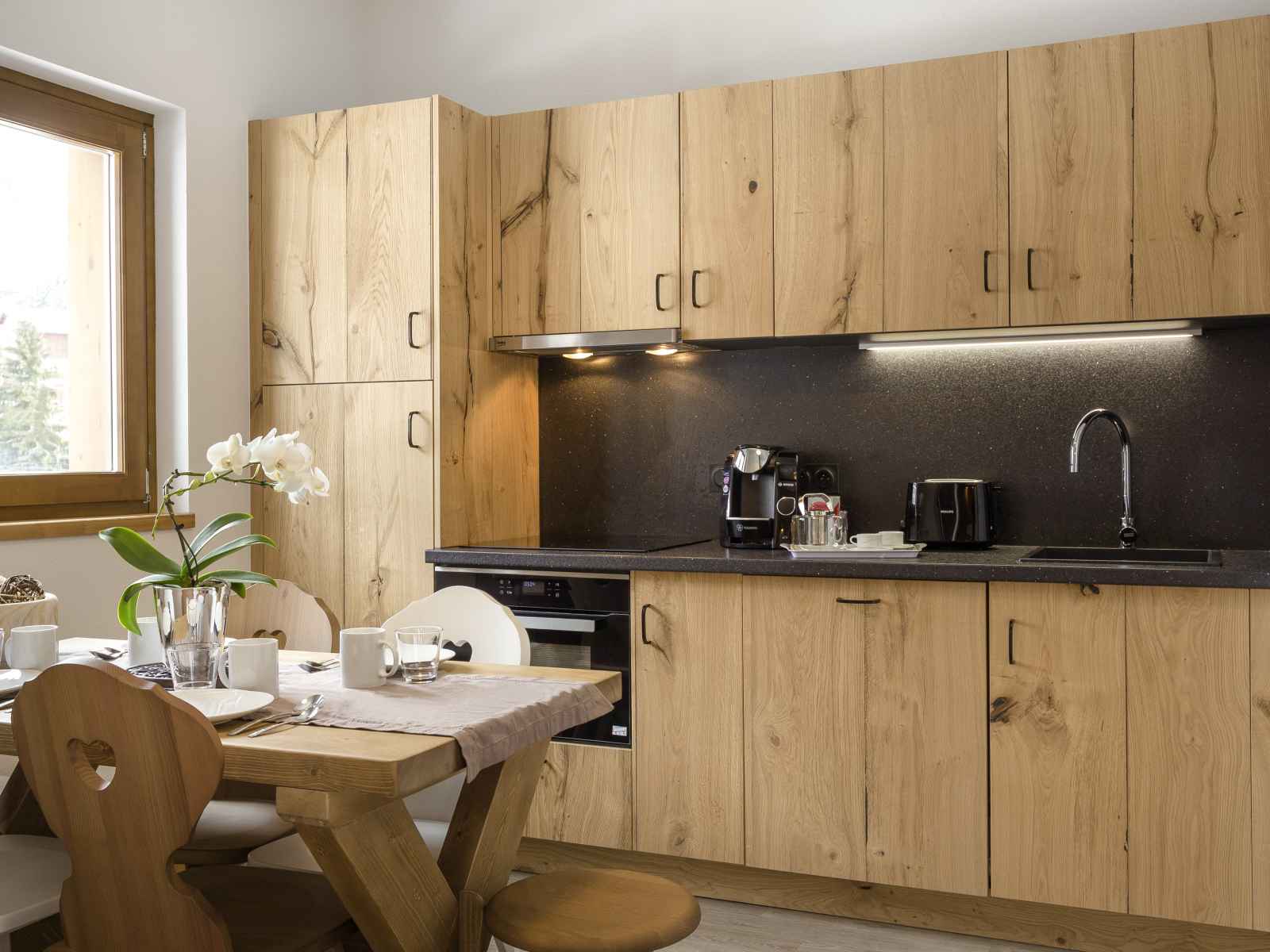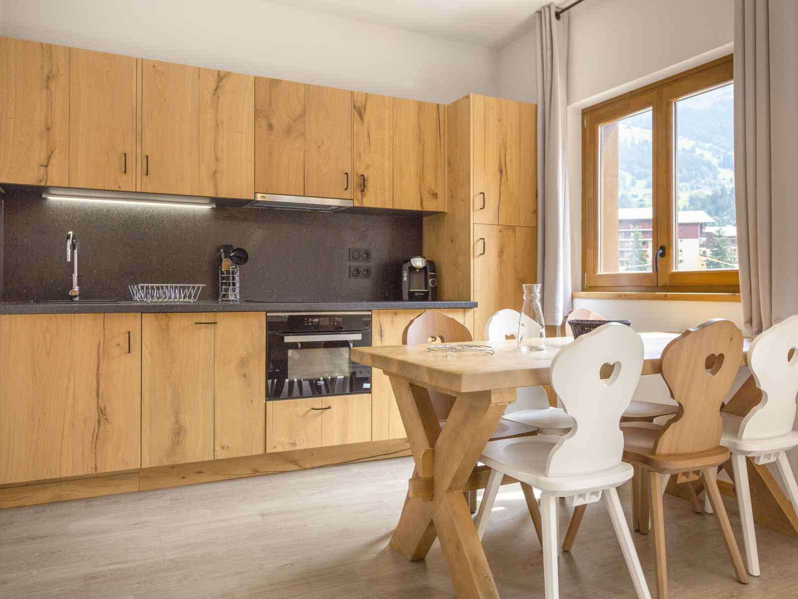 Cuisine ouverte avec un espace repas avec table à manger et chaises