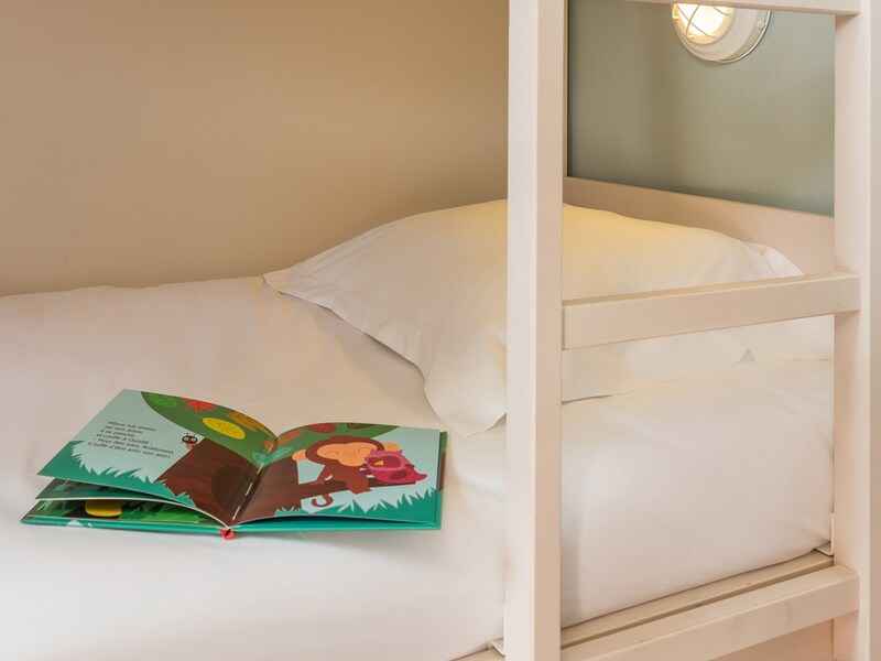 - pièce à vivre : 2 lits-banquettes et 1 coin nuit avec 2 lits superposés (recommandés pour les enfants)