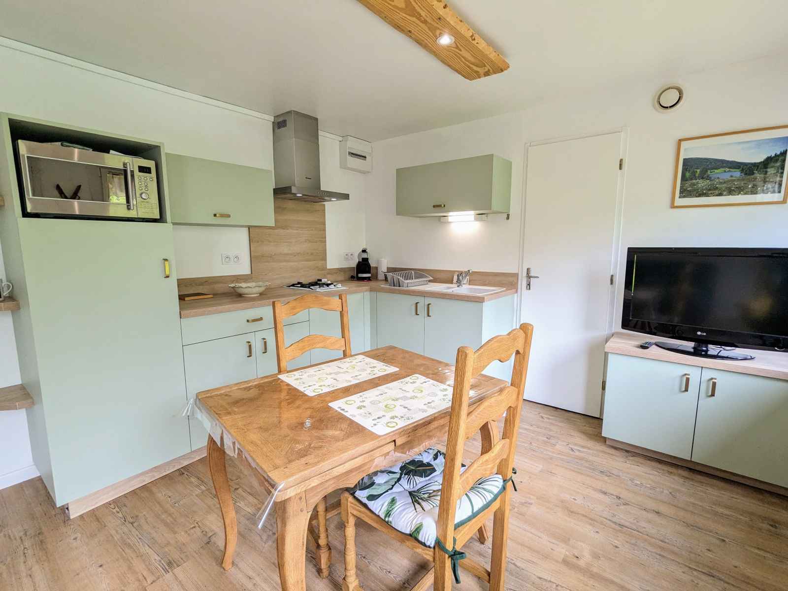 Appartement dans la maison des propriétaires, mitoyen à un autre logement touristique, au premier étage ainsi composé : Pièce de vie (volets roulants électriques) avec cuisine équipée (cuisine équipée 2 feux gaz, cafetière filtre et dosettes, grille pains, bouilloire, micro onde four combiné, appareil à raclette, réfrigérateur avec compartiment congélation.). TV. WIFI. Coin salon Une chambre (volets qui se déplient) avec un lit 140x190cm et une salle d'eau avec cabine de douche et WC. Extérieur : Balcon avec salon de jardin privatif, une plancha à disposition. Une place de parking privative. Dans local commun avec deuxième logement : à disposition lave linge et sèche linge.