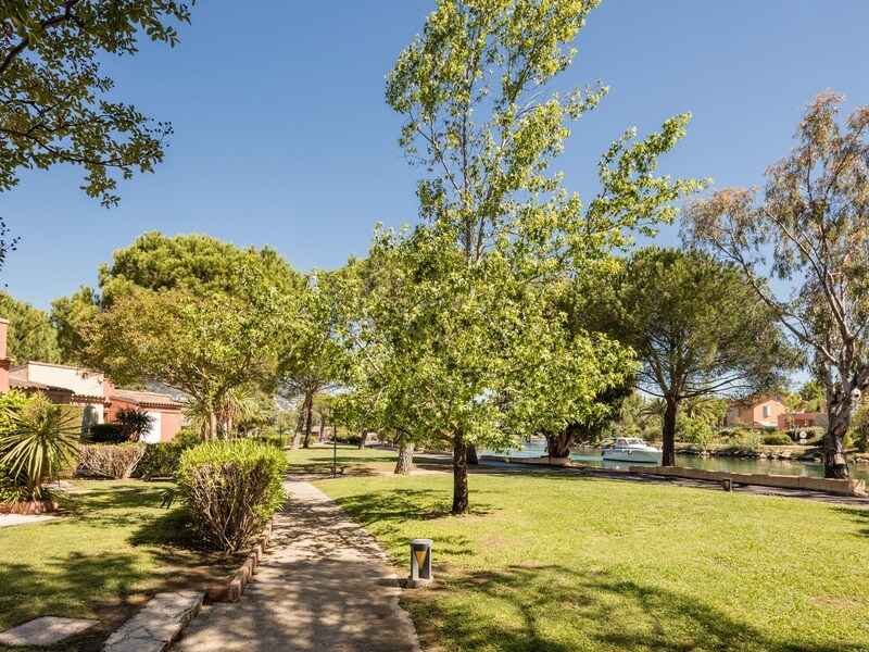 Sur une presqu'île formée par un méandre de la rivière siagne, à 800 m de la plage, la résidence cannes mandelieu se rejoint par la route ainsi que par la mer grâce à un ponton privé permettant d'accoster directement en bateau. a 8 km de la croisette à cannes. les petits bâtiments aux volets colorés, dans le style méridional, se