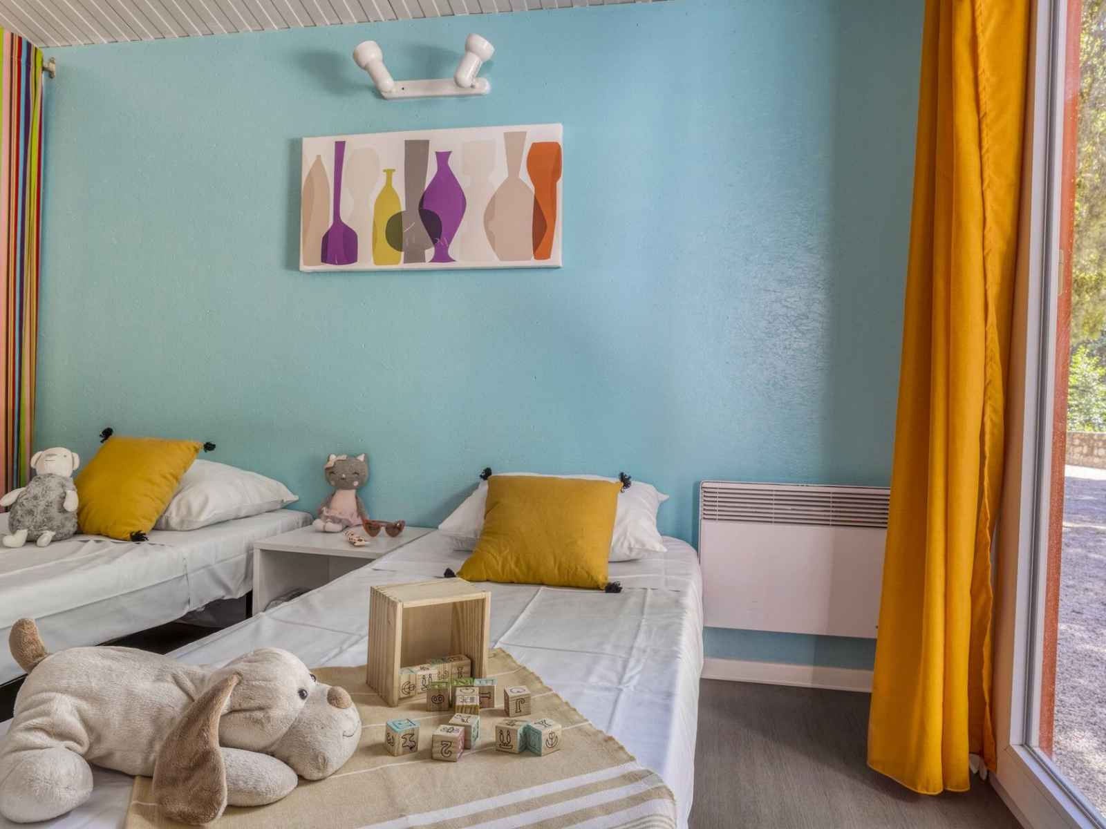 1 chambre avec 2 lits simples communicante salle de bain, wc et tv