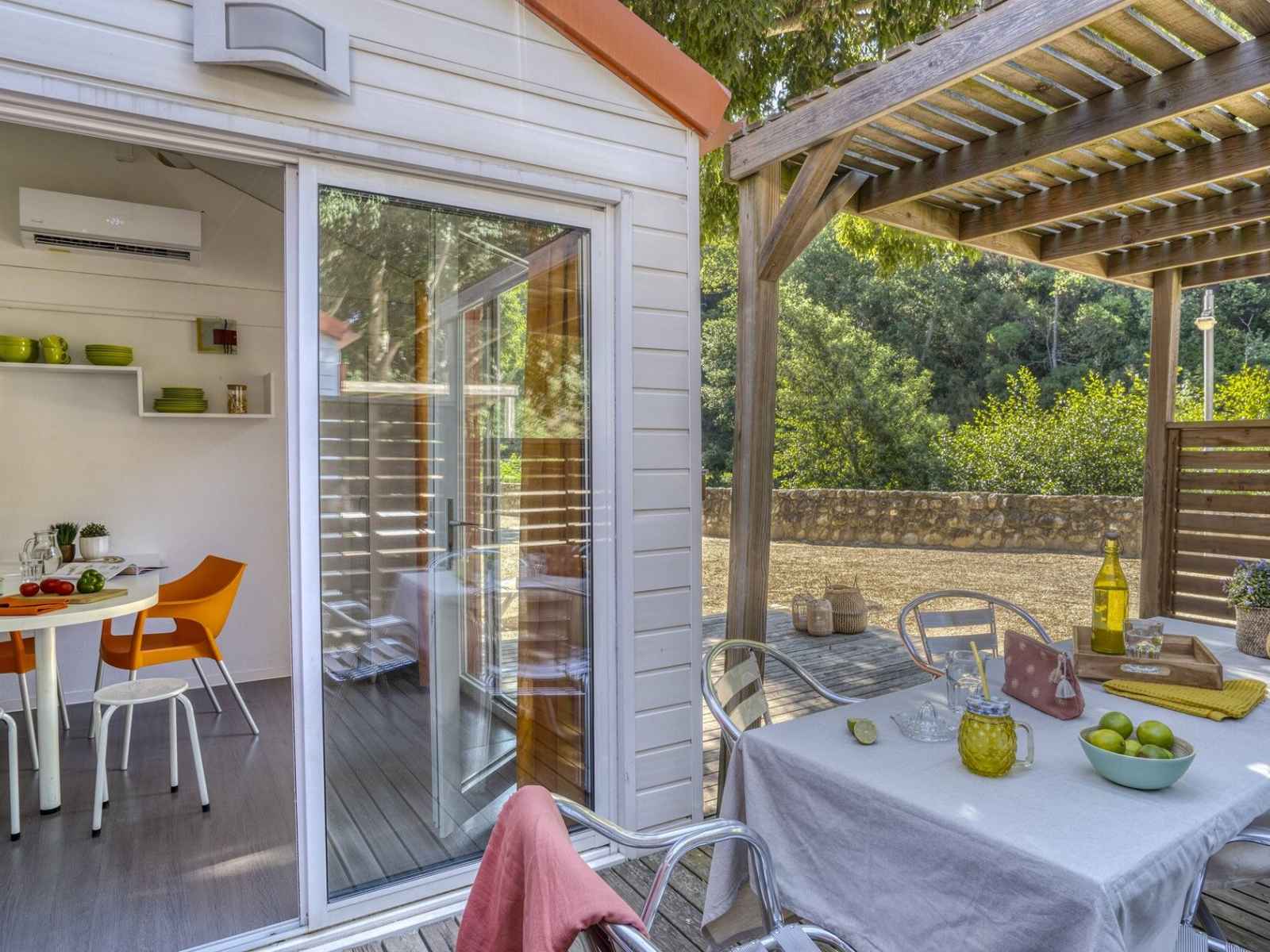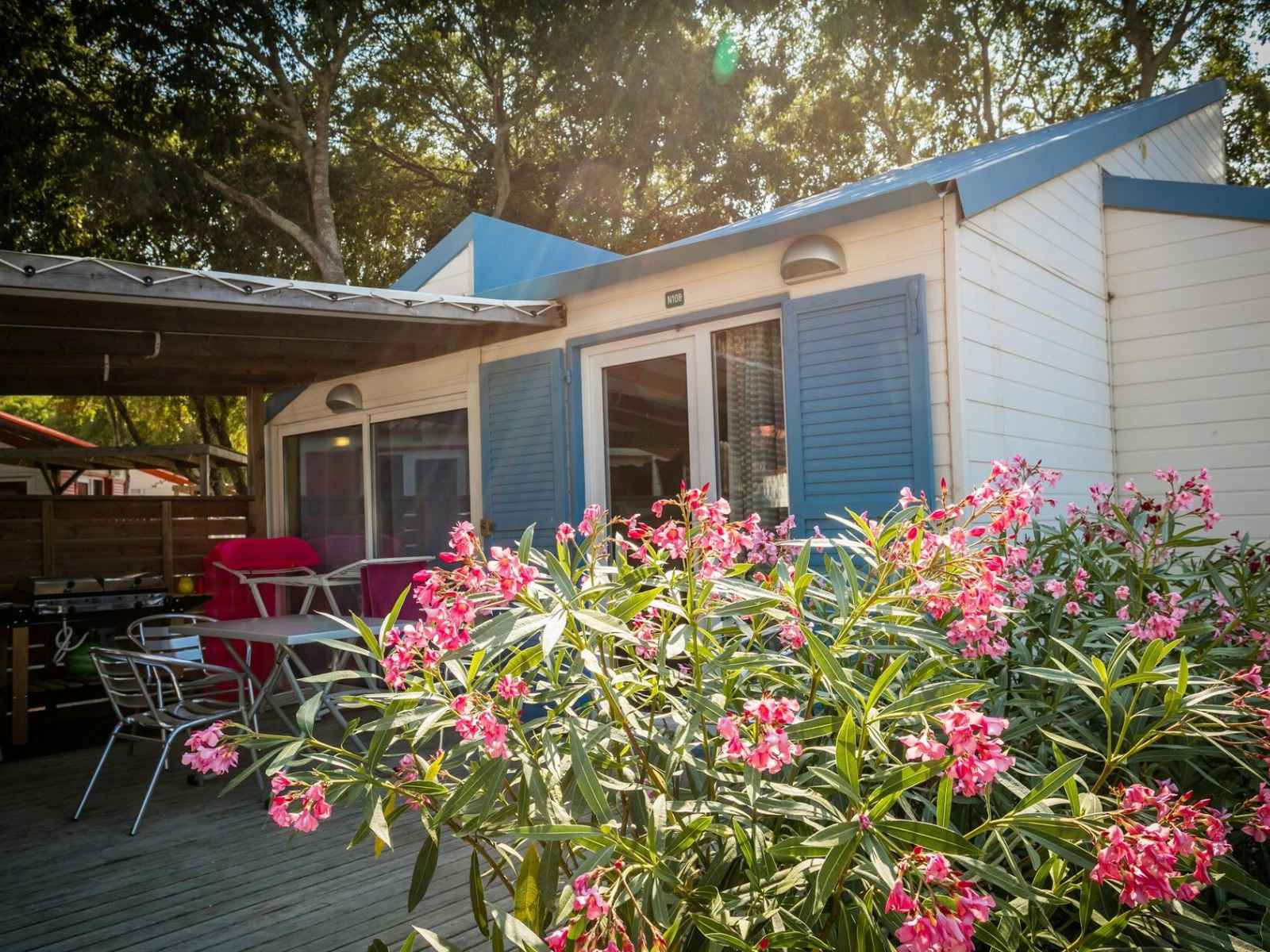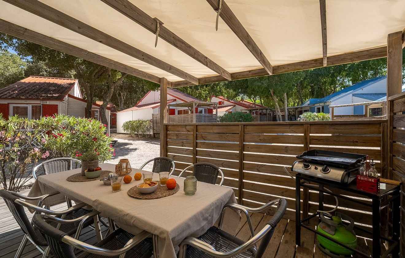 son environnement enchanteur. À 10 mn en voiture de la plage (bus-navettes gratuites pour la plage et le centre-ville), le camping propose des logements de standing, climatisés et équipés avec kitchenette (micro-ondes, four, lave-vaisselle dans les chalets), salle de bains ou de douche, wc, terrasse avec mobilier de jardin. une place de parking et un accès wifi illimité et gratuit pour 4 appareils.