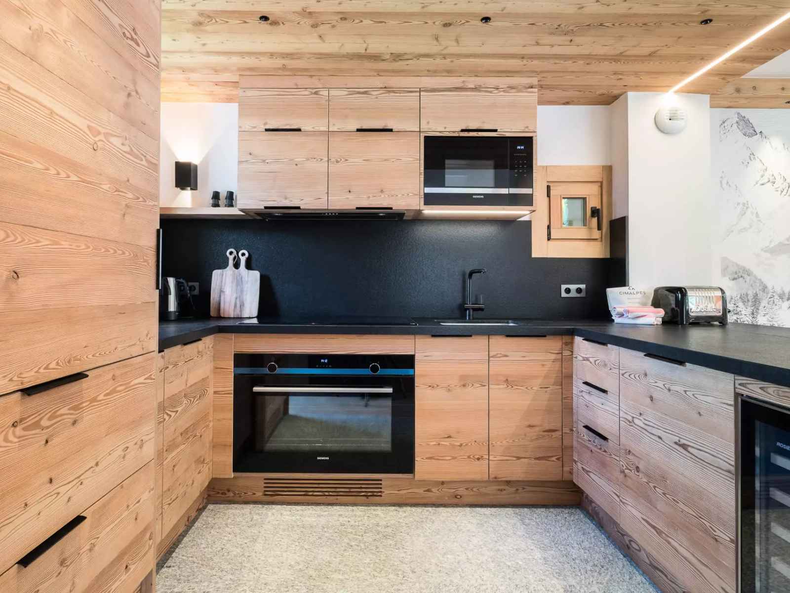 - Cuisine ouverte équipée : réfrigérateur/congélateur, lave-vaisselle, micro-onde, mixeur, bouilloire, grille-pain, cafetière électrique, Nespresso