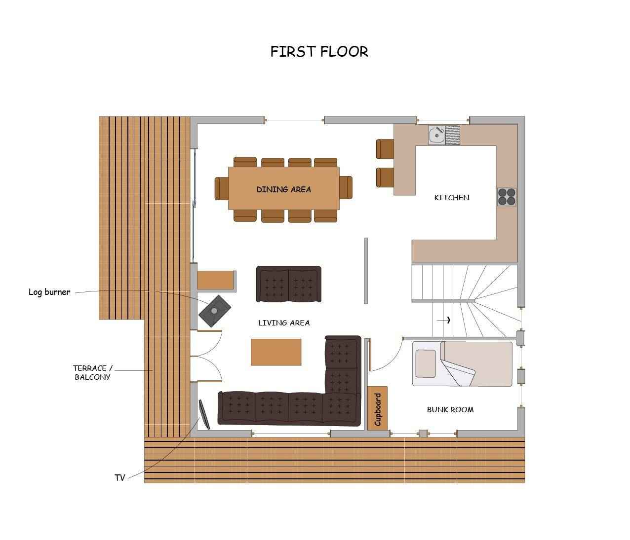 Grande pièce à vivre avec cuisine ouverte équipée, coin repas accès à la terrasse, coin salon avec télévision, poêle à bois (bois non fourni), coin cabine: lits superposés, rangement