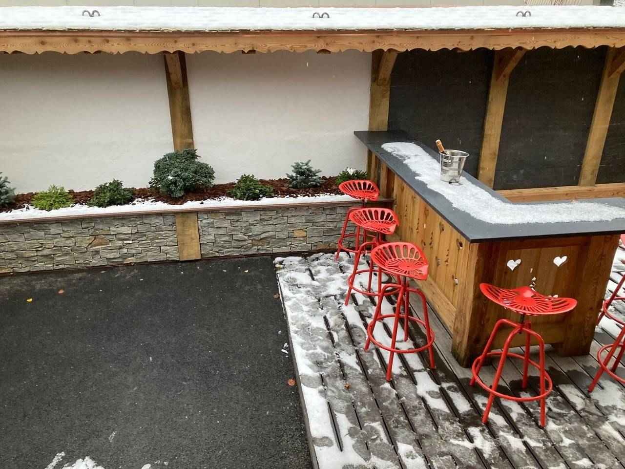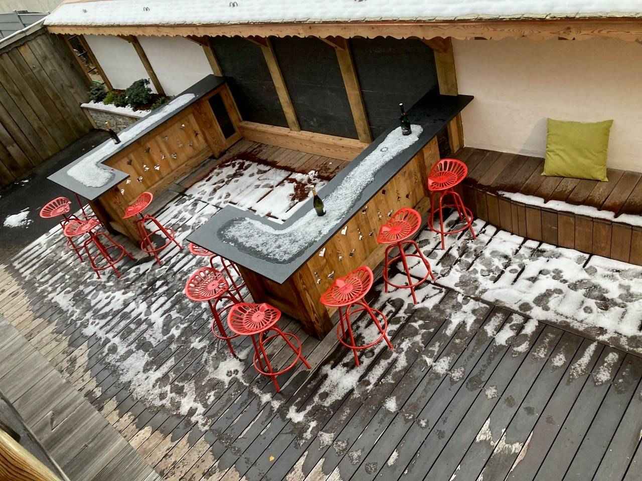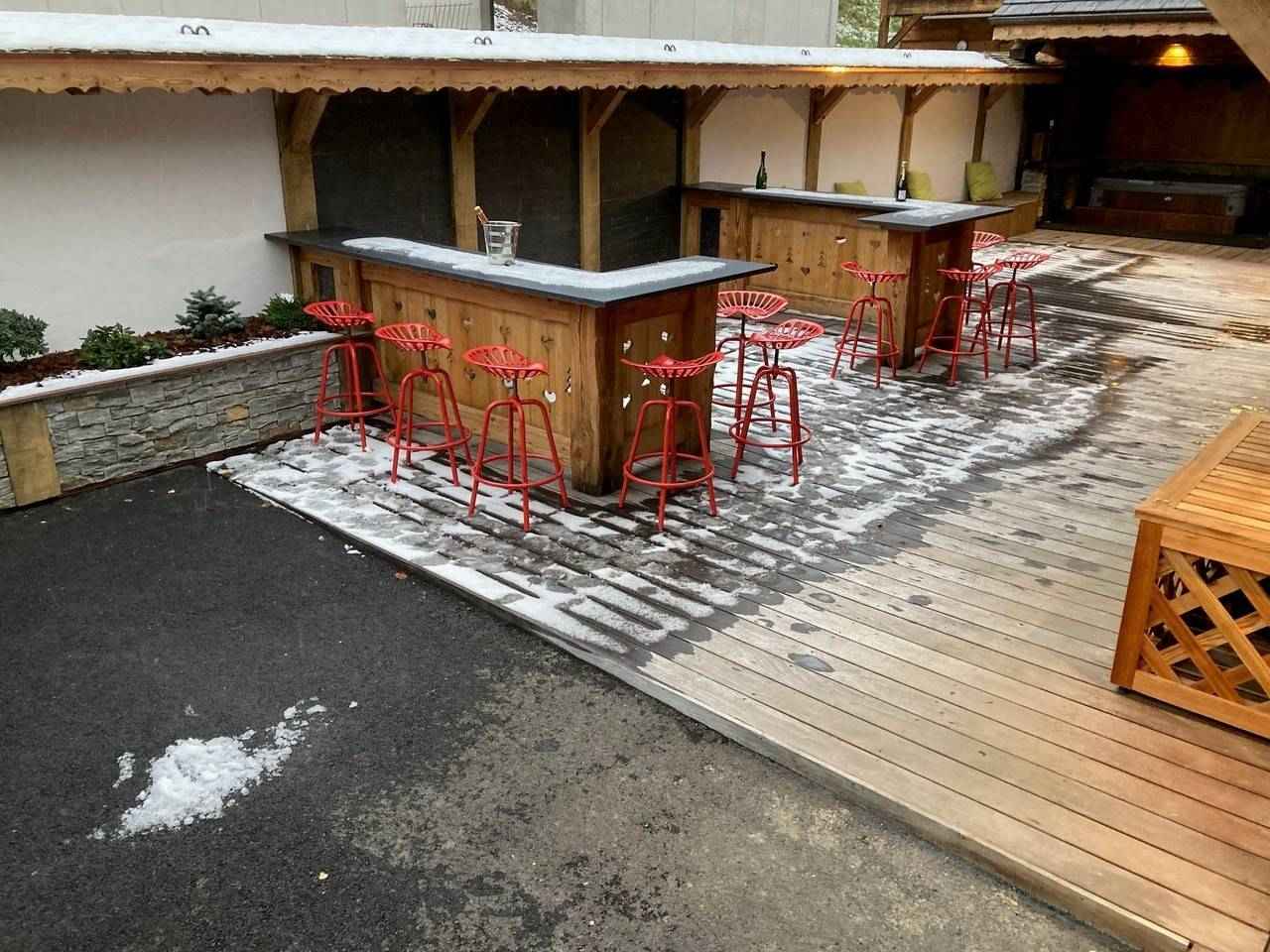 à manger, accès à la grande terrasse et espace extérieur avec jacuzzi, Chambre double (160x200) avec tv, douche et lavabo, Ski room avec sèche-chaussures, WC