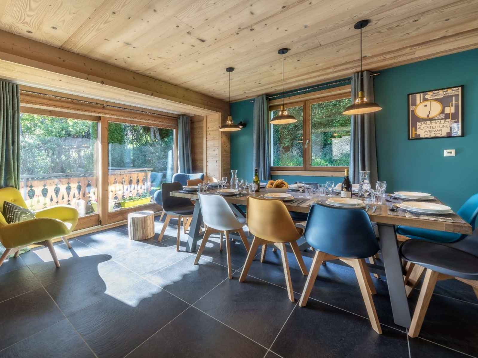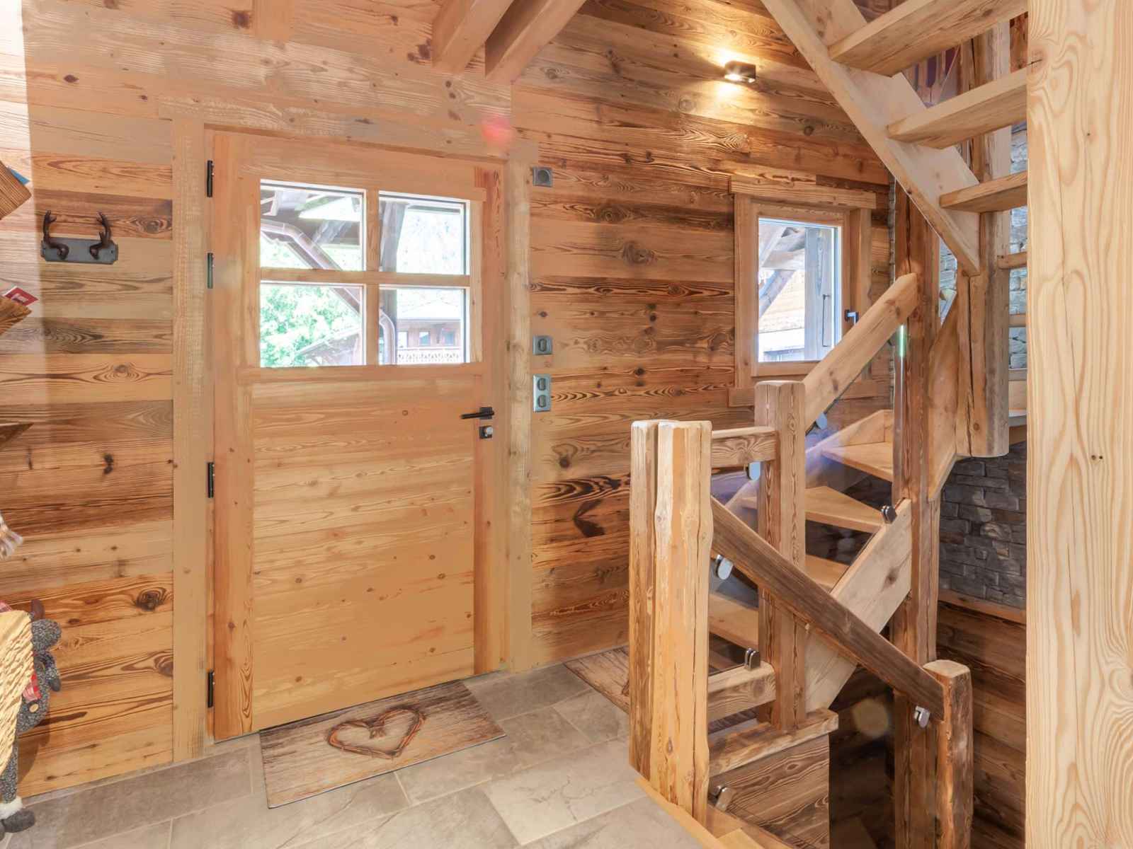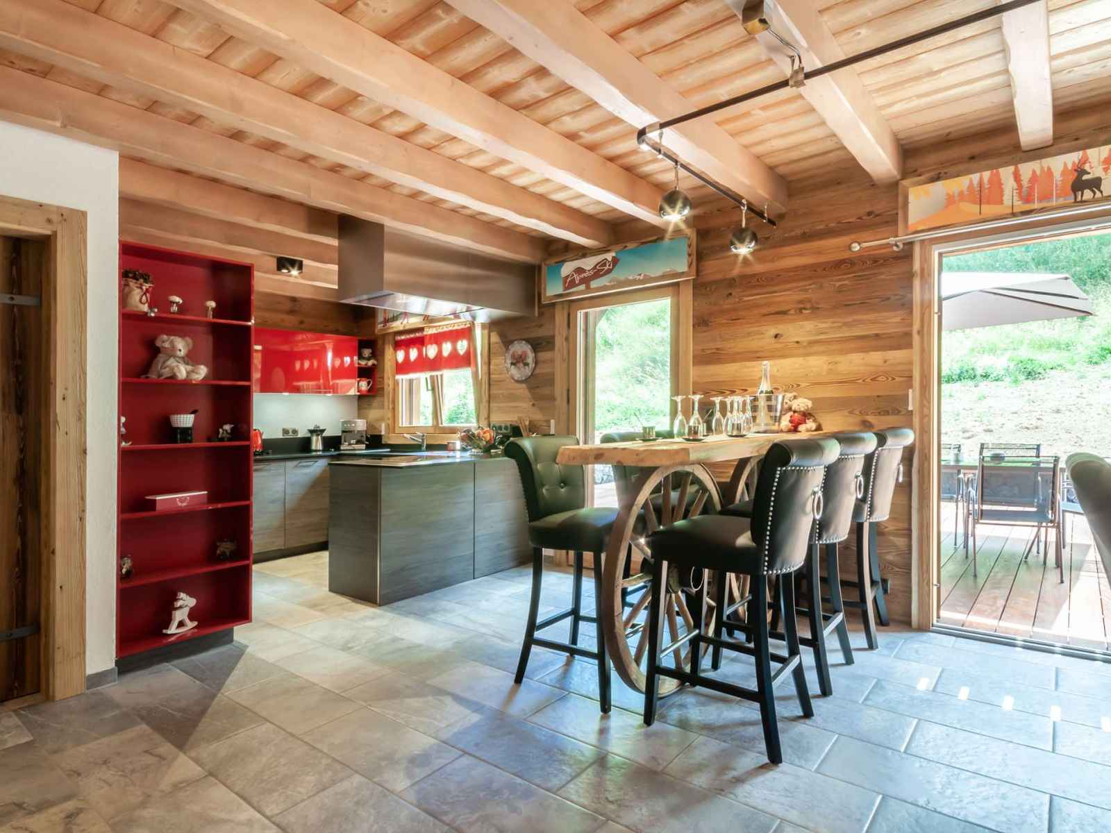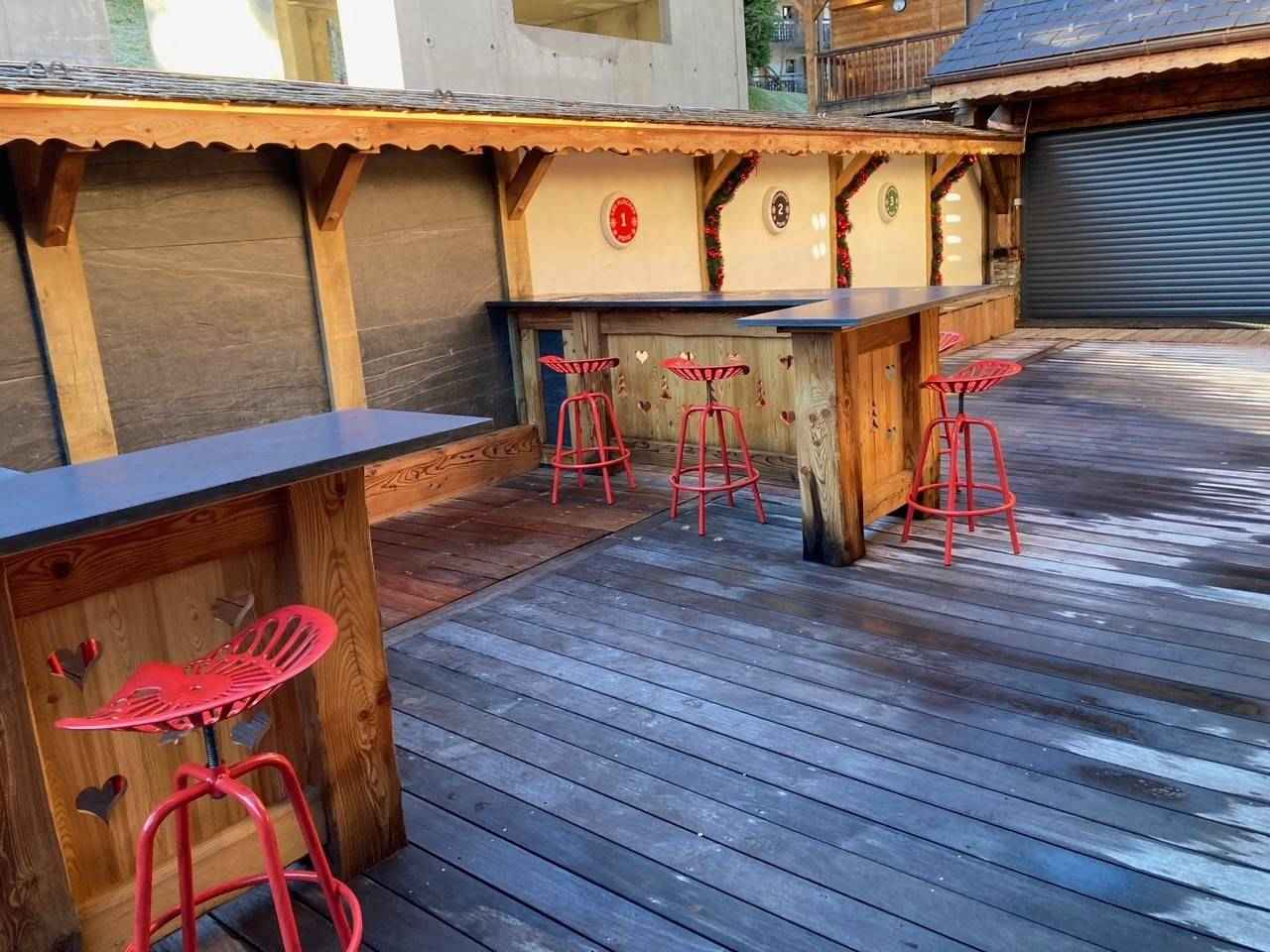 à manger, accès à la grande terrasse et espace extérieur avec jacuzzi, Chambre double (160x200) avec tv, douche et lavabo, Ski room avec sèche-chaussures, WC