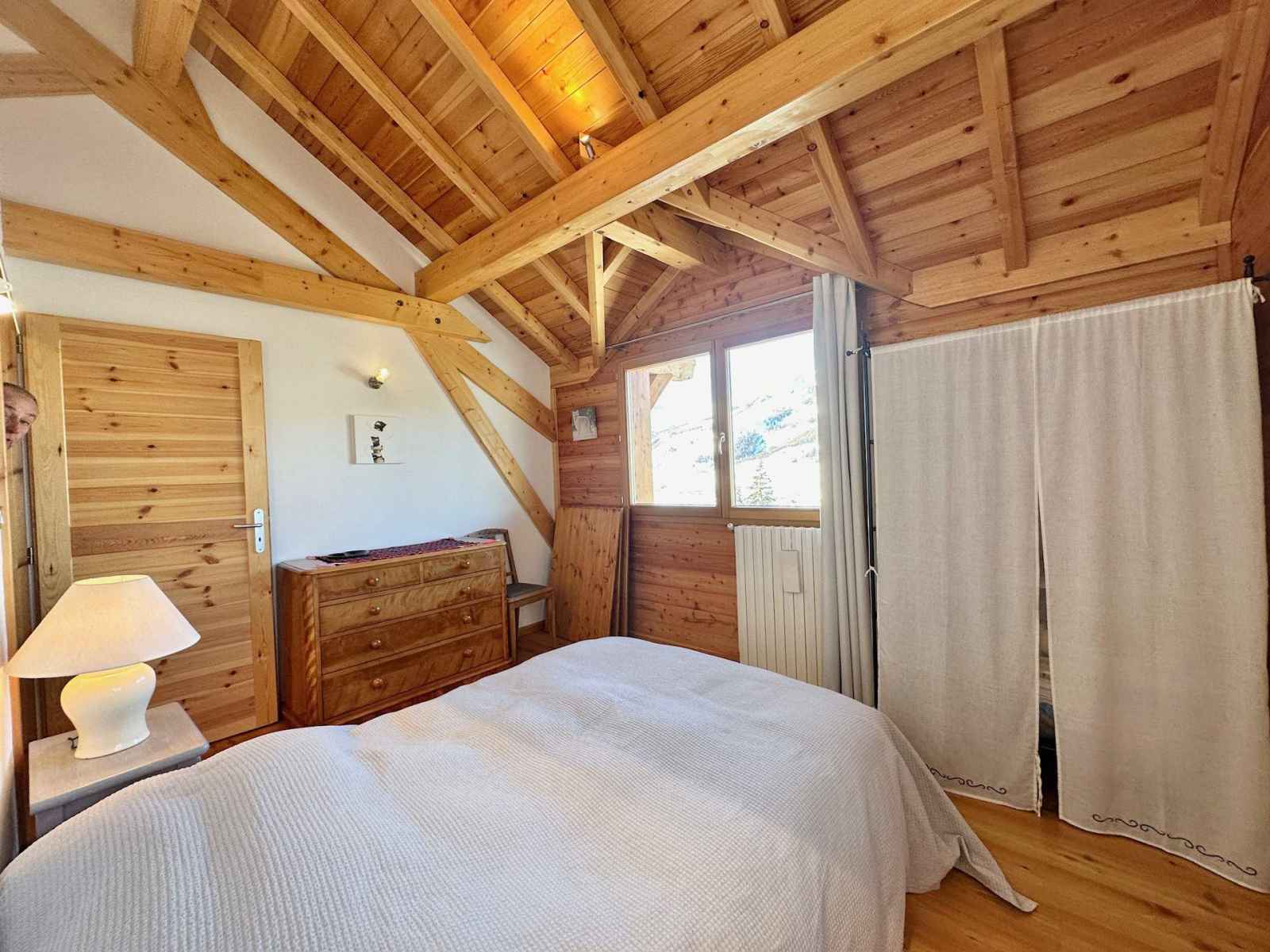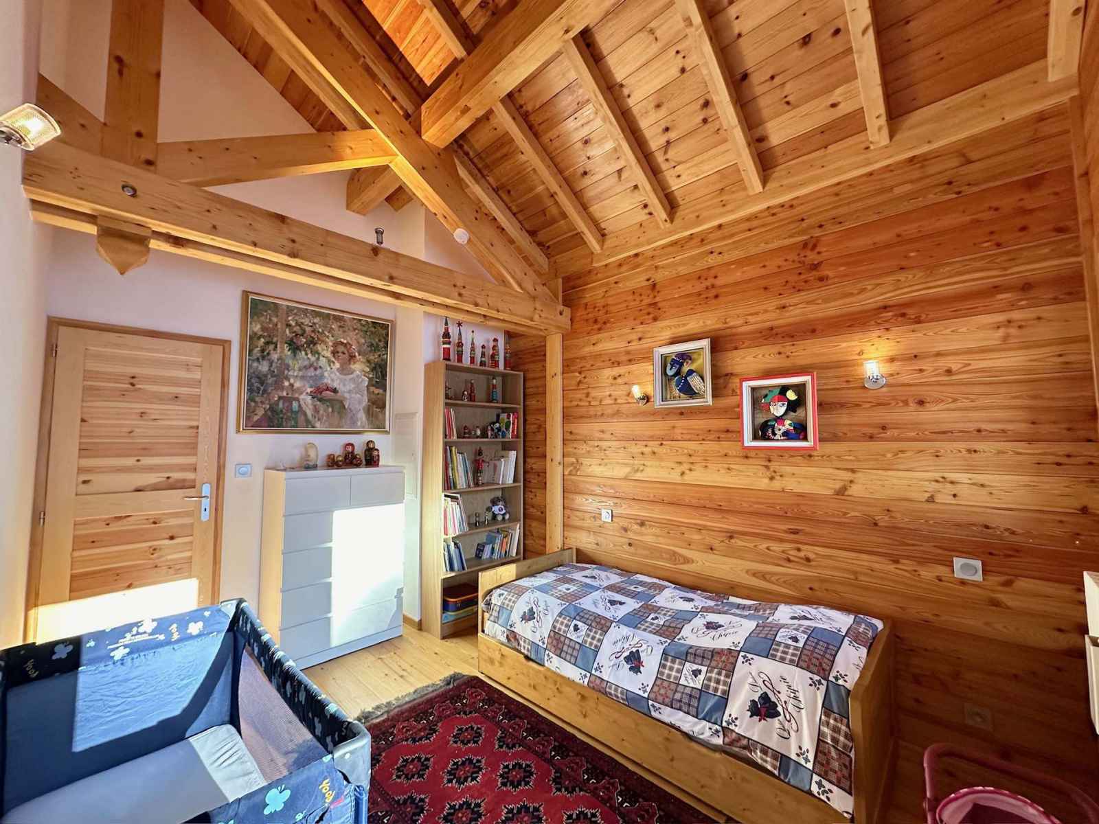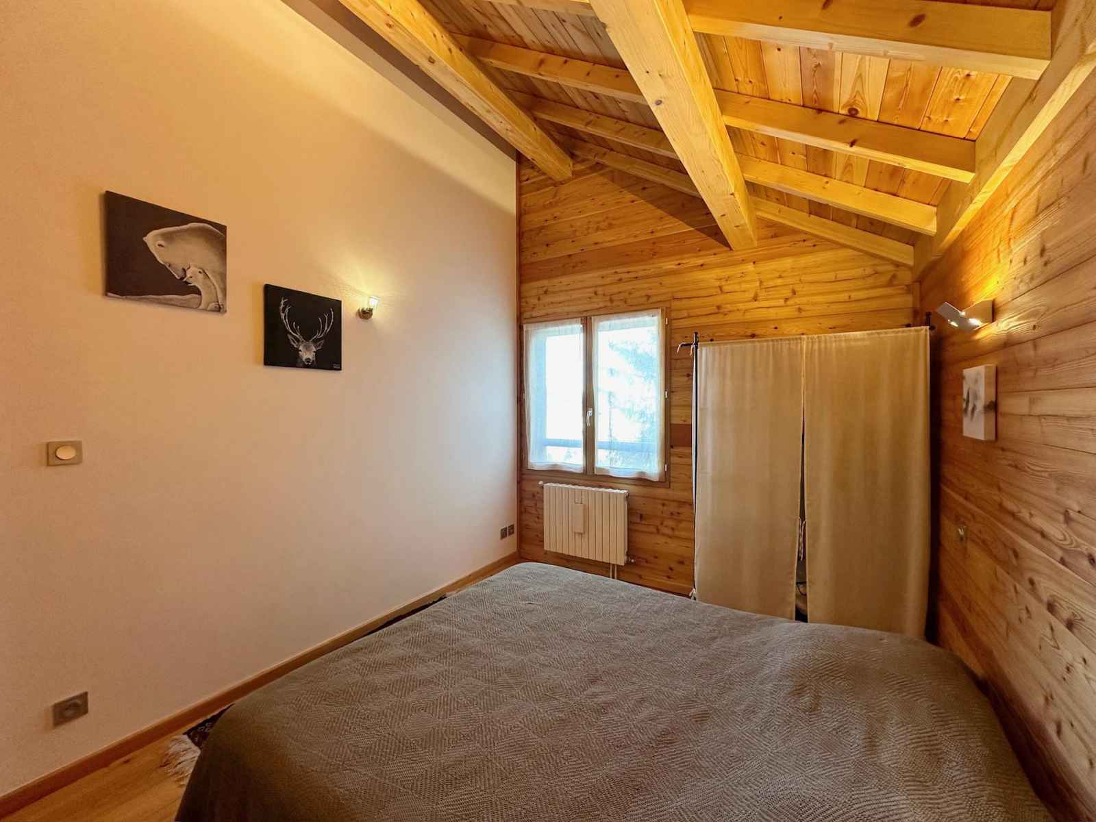 les pistes. Sur la gauche, une salle dédiée aux moments de convivialité avec une kitchenette équipée d'une cafetière a l'italienne, un bar, un baby-foot, un sauna et une salle de sport pour des instants de détente après le ski. À l’étage principal, une vaste pièce de vie baignée de lumière avec une cuisine ouverte équipée et une cheminée centrale idéale pour des soirées chaleureuses. Une première chambre double avec une grande salle de douche attenante complète ce niveau. À l’étage supérieur deux grandes chambres doubles, une chambre pour enfants avec deux lits simples gigogne et un lit bébé ainsi qu'une salle d'eau et une salle de bain offrent tout le confort nécessaire pour accueillir toute la famille. Pour la sécurité des enfants l'escalier est équipé d'une barrière amovible assurant leur tranquillité et celle des parents. Ce chalet allie charme authentique et équipements modernes pour des vacances inoubliables en famille ou entre amis. Profitez du sauna pour un moment de relaxation, d’une salle de sport pour les plus actifs et d’une ambiance chaleureuse dans un cadre enchanteur. Contactez-nous dès maintenant pour organiser votre séjour et vivre des instants magiques au cœur de la montagne! Le chalet n'est pas adapté aux PMR. Le chalet dispose d’un ski room et de deux places de parking privées.