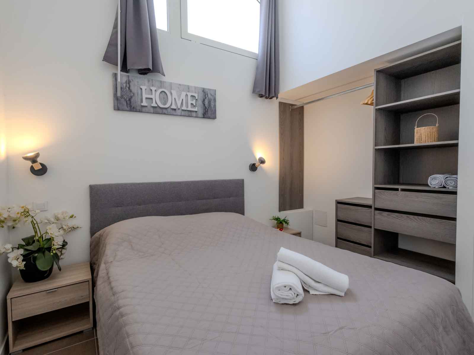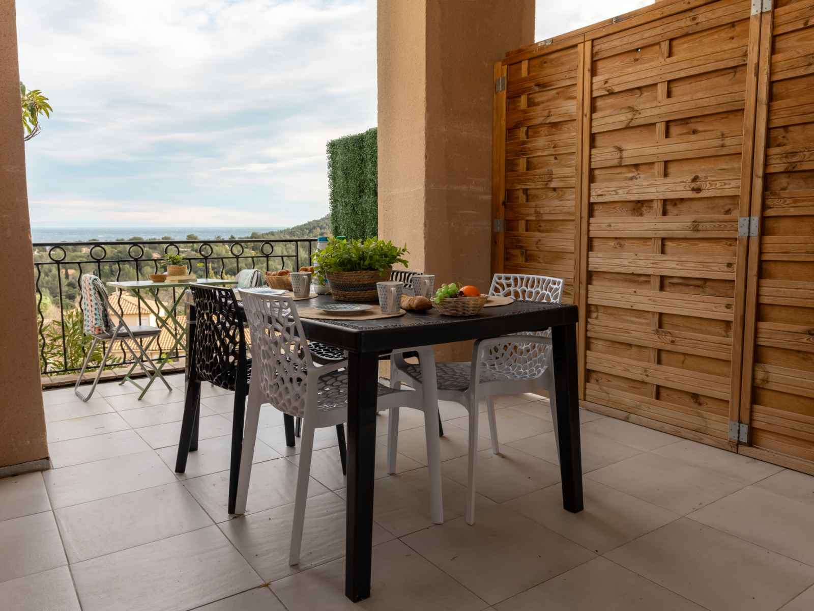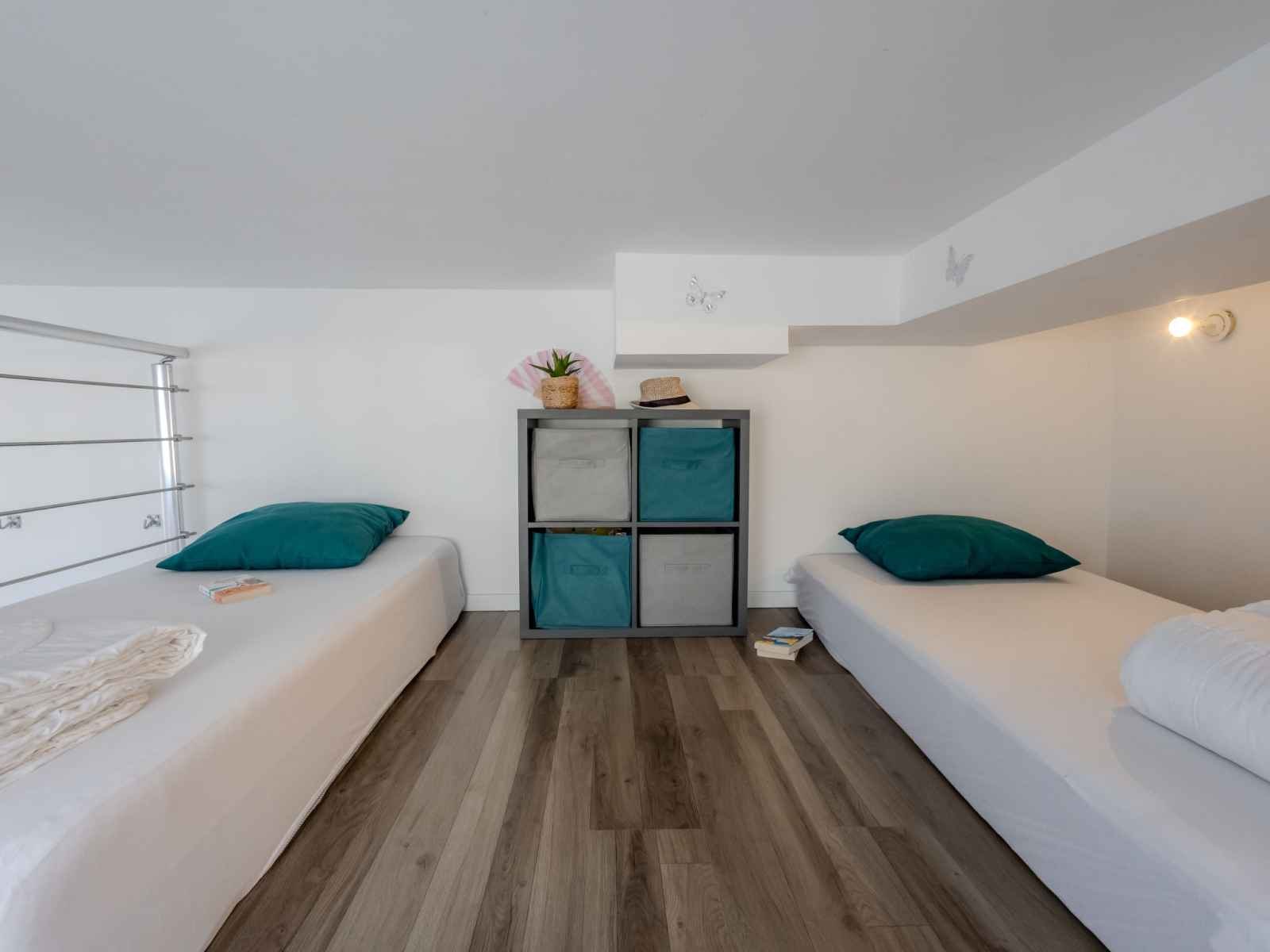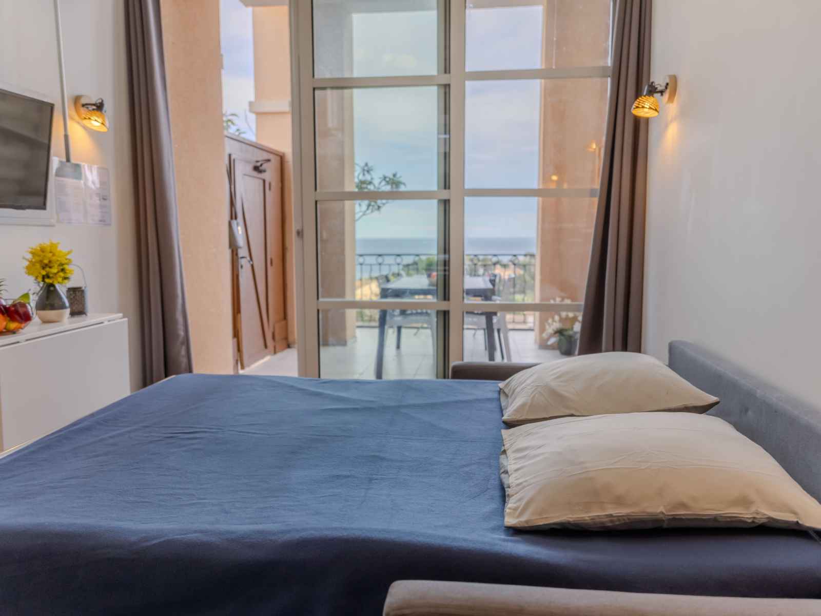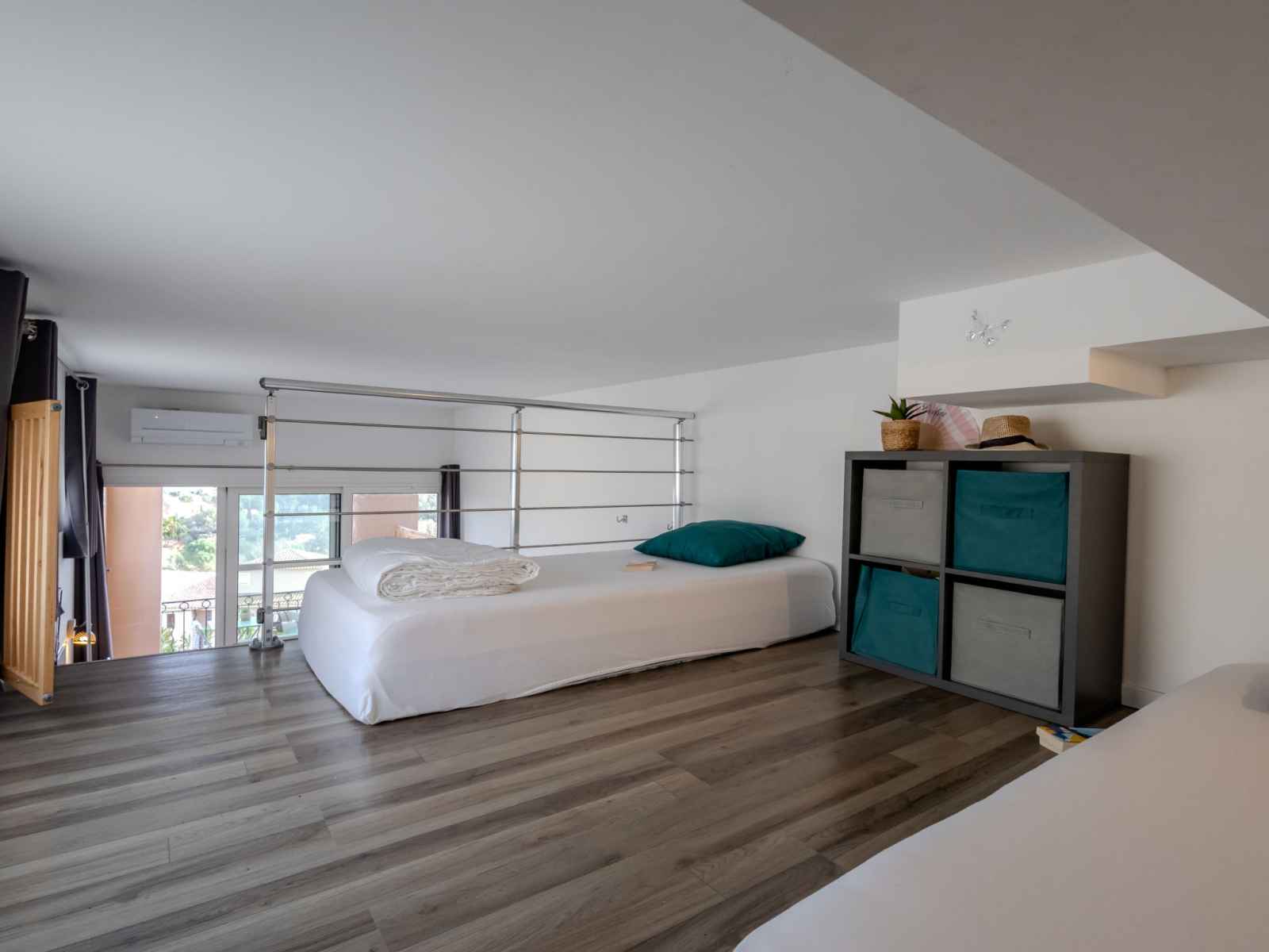 longueur 190 cm). Petite cuisine ouverte (four, 2 plaques à induction, grille-pain, bouilloire électrique, cafetière électrique, Capsules pour machine à café (Nespresso) (NON INCLUSES)) avec table pour les repas. Douche/WC. Chauffage électrique, air-conditionné, chauffage à air chaud. À l'étage supérieur: (escalier raide) galerie avec 2 lits (90 cm, longueur 190 cm). Terrasse 15 m2, couverte, situation sud. Meubles de terrasse. Très belle vue sur la mer. A disposition: lave-linge, fer à repasser, sèche-cheveux. Internet (Connexion WIFI, en sus). Place de parking (1 Voiture). Veuillez noter: logement non-fumeur. Détecteur de fumée. Annonce d'un particulier (art 155, IV du CGI).