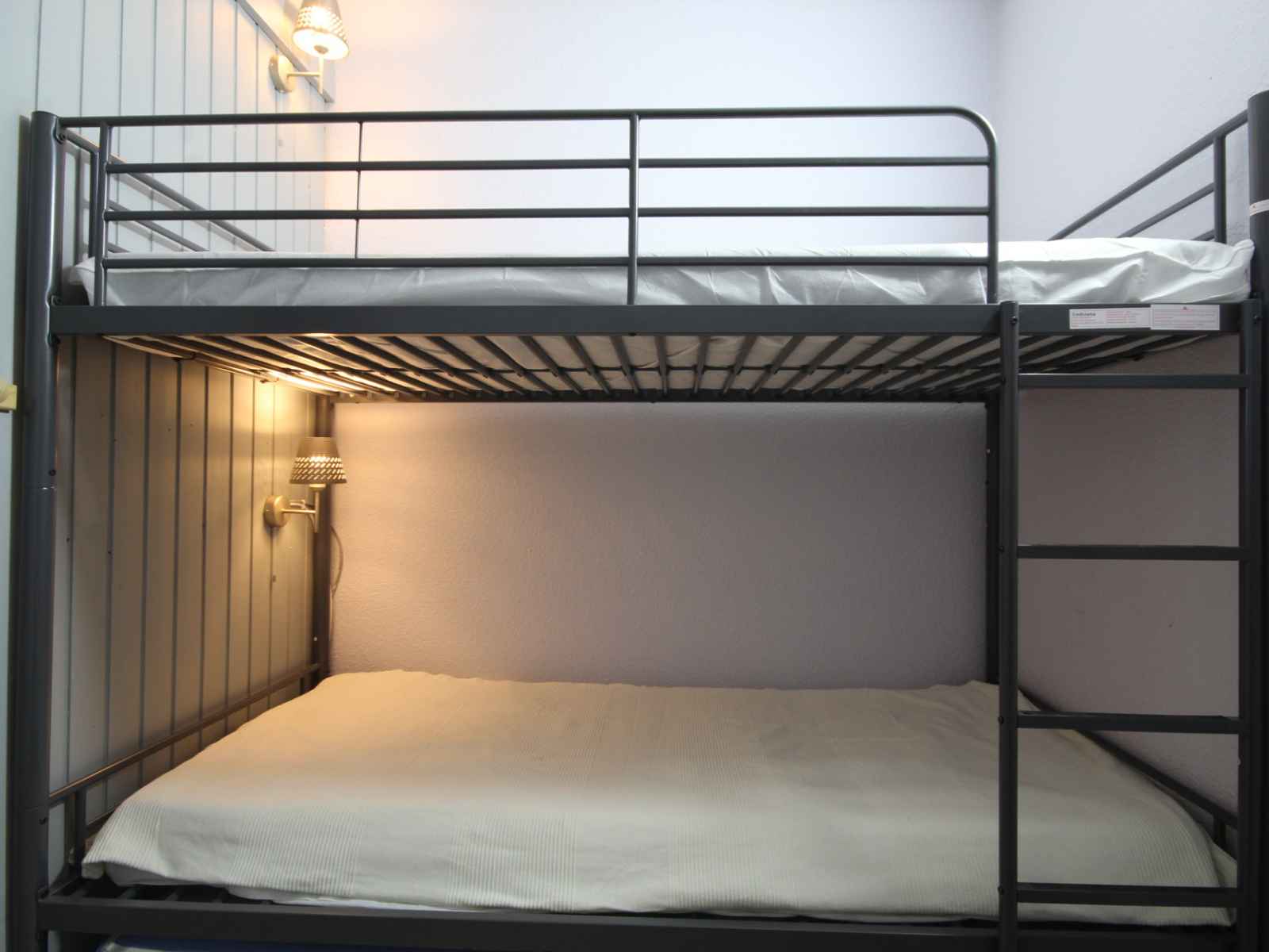 et une télévision. Coin cabine dans l'entrée avec 2 lits simples superposés et 1 lit tiroir (Le couchage en hauteur ne convient pas aux enfants de moins de 6 ans) Le coin cuisine est équipé de 2 plaques vitrocéramiques, d'un mini four, d'un réfrigérateur- congélateur, d'un micro onde, d'un grille pain, d'une cafetière Senseo + une cafetière à filtre et d'une bouilloire. La salle de bain et toilettes sont dans la même pièce. Lave linge inclus. Sèche chaussures à l'entrée. Le sol est en parquet. Linge de lit, de bain et ménage fin de séjour en supplément. Non fumeur. Animaux refusés