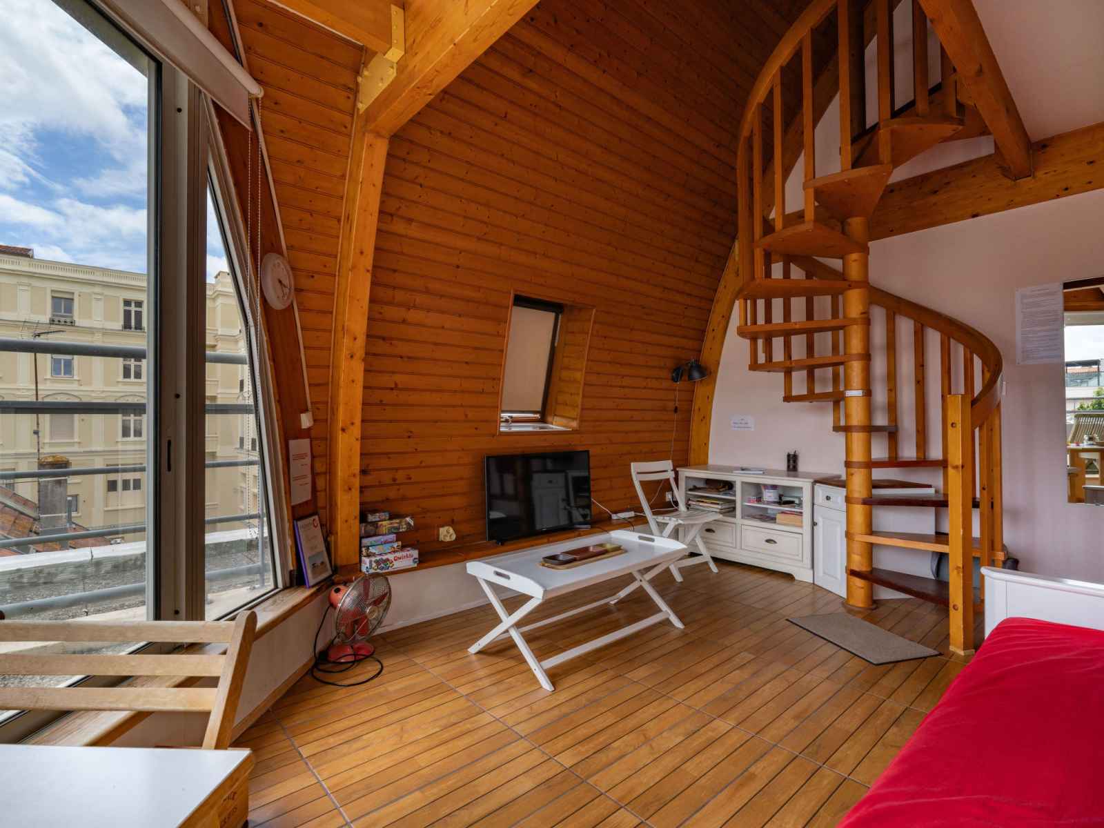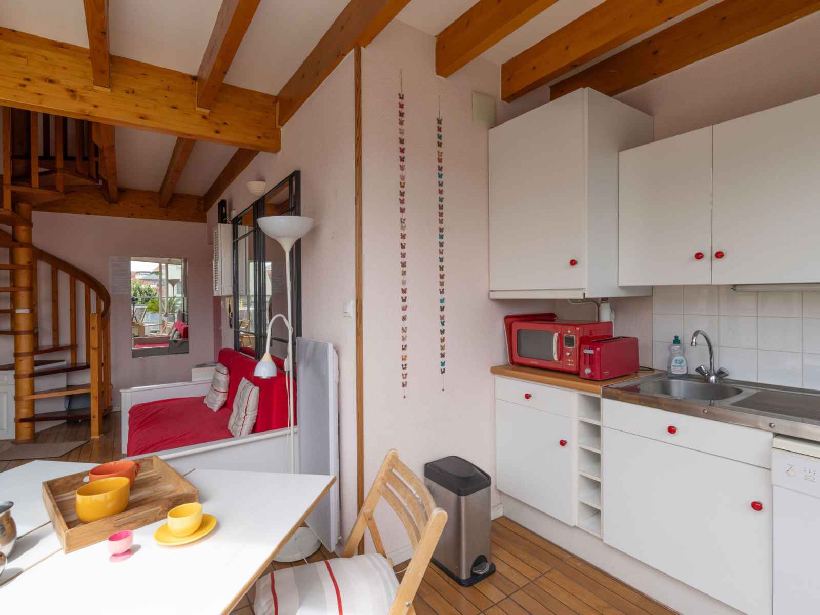 Apt 2 pièces 32 m2 au 3ème étage. aménagement confortable et agréable: séjour/salle à manger avec tv (écran plat). sortie sur la terrasse. cuisine ouverte (2 plaques de cuisson, four, lave-vaisselle, grille-pain, bouilloire électrique, micro-ondes). À l'étage supérieur: 1 chambre avec 1 grand-lit (1 x 140 cm). douche/wc. chauffage