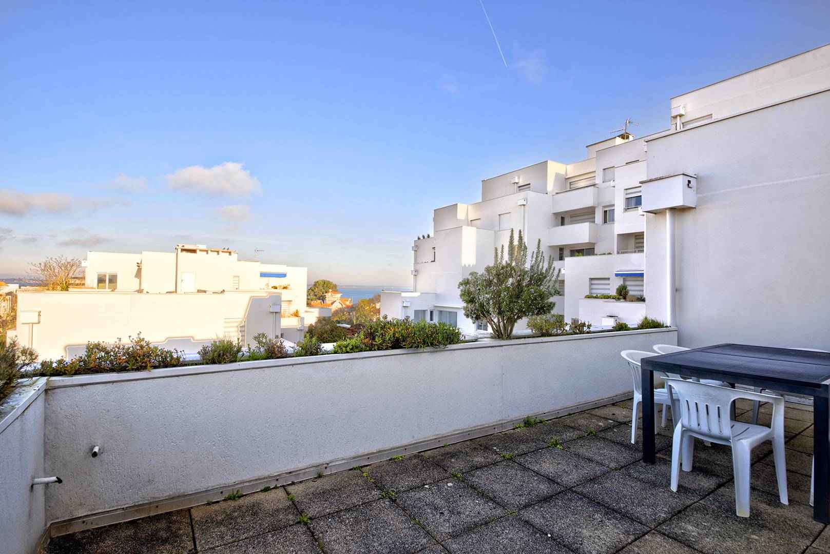 Spacieuse terrasse (plus de 6 m²), accessible depuis la cuisine et le salon, avec une très belle vue dominante sur la ville et le bassin d’Arcachon. Store-banne, mobilier…