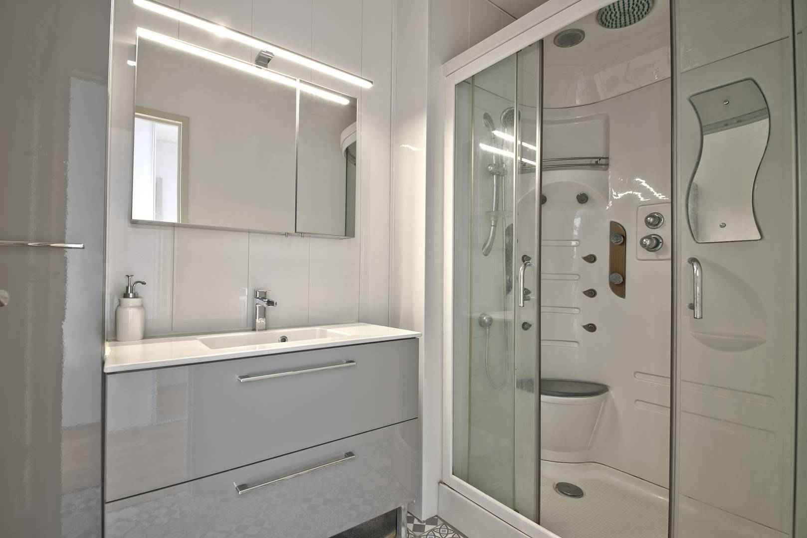 placard / penderie – WC séparés avec lave-mains – Salle d’eau (cabine hydromassante) – Chambre exposée Sud et Ouest : 1 lit en 160, placard / penderie, TV – Salle à manger – Salon exposé Nord : 1 canapé lit en 120, fauteuils, TV… - Très belle cuisine équipée (réfrigérateur américain, four traditionnel, four micro-ondes, hotte, lave-vaisselle, 6 feux gaz, lave-linge / sèche-linge…).
