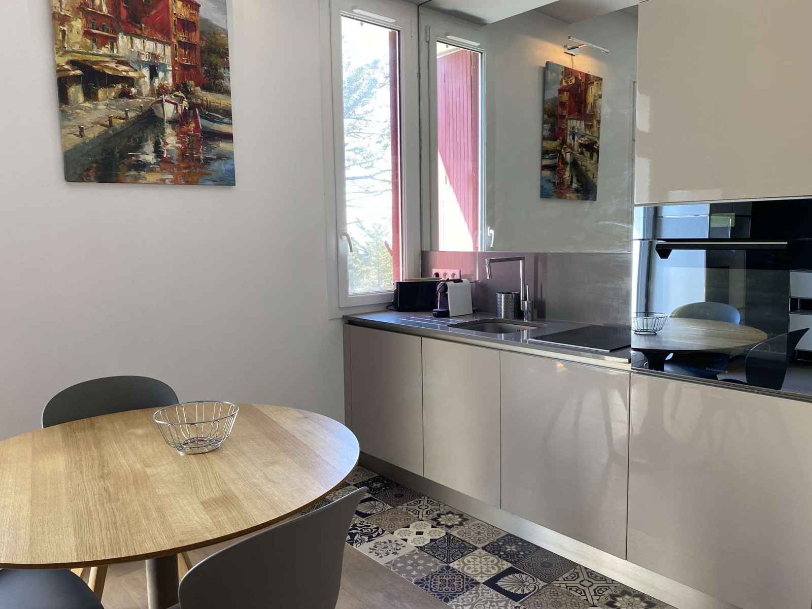 La pièce de vie spacieuse inclut un canapé, une télévision et une cuisine ouverte, aménagée et entièrement équipée (réfrigérateur/congélateur, four, plaque à induction 2 foyers, micro-ondes, grille-pain, cafetière NESPRESSO, etc.). L’ensemble s'ouvre sur un balcon de 3 m² exposé Sud, offrant une belle vue sur le bassin et un espace idéal pour vos repas en extérieur.
