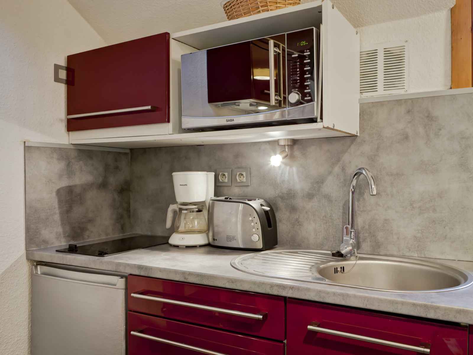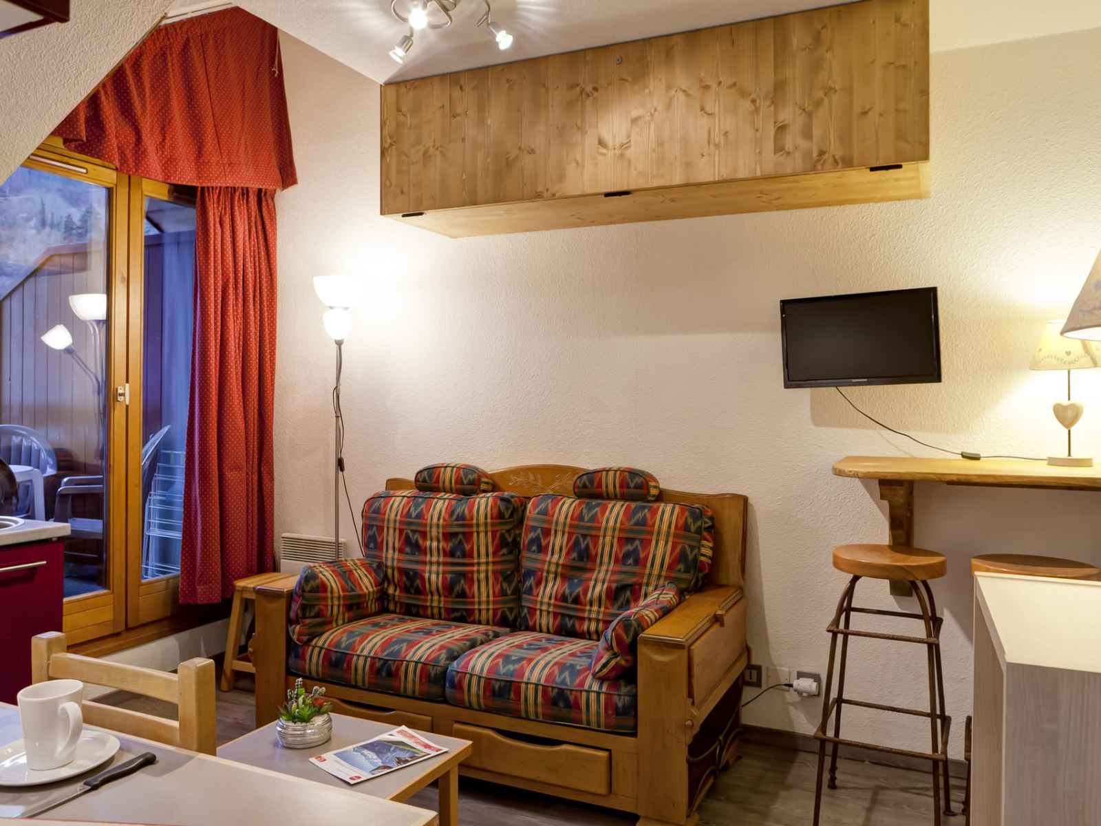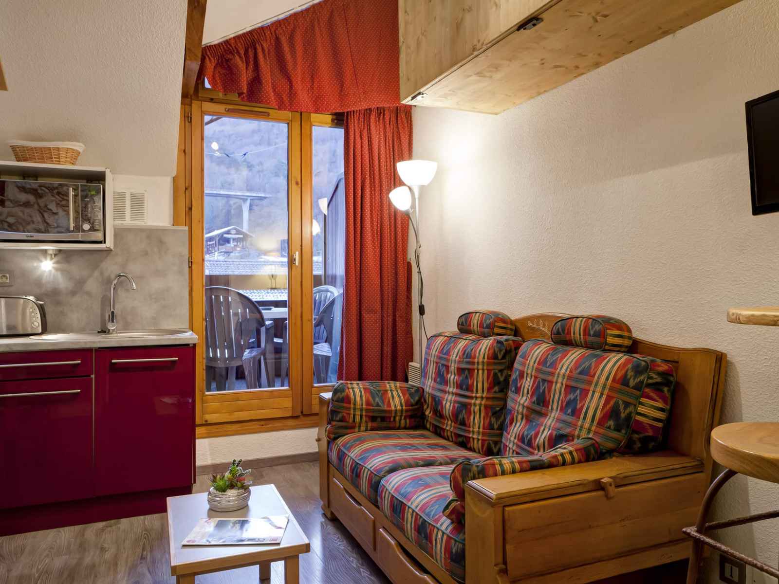 cuisine équipé avec : plaques électriques, hotte de cuisson, micro-ondes, lave-vaisselle, réfrigérateur avec freezer, cafetière, bouilloire et grille-pain. COUCHAGES : - Chambre avec fenêtre de toit : un lit double en 140 cm (2 personnes). - Coin montagne : un ensemble de lits superposés (2 personnes). Salle d'eau avec douche et toilettes. Lave-linge. Accès internet WIFI inclus. Casier à skis. Place de parking couverte incluse dans la location. CONDITIONS DE LOCATION : Linge de lit inclus du 15/12 au 15/04 pour les courts séjours d'hiver. Le linge de lit n'est pas inclus pour les séjours de cures toute l'année. Linge de toilette et ménage de fin de séjour non inclus et sur demande. Caution demandée à l'arrivée. Animaux non autorisés. INTERDICTION DE FUMER DANS LE LOGEMENT