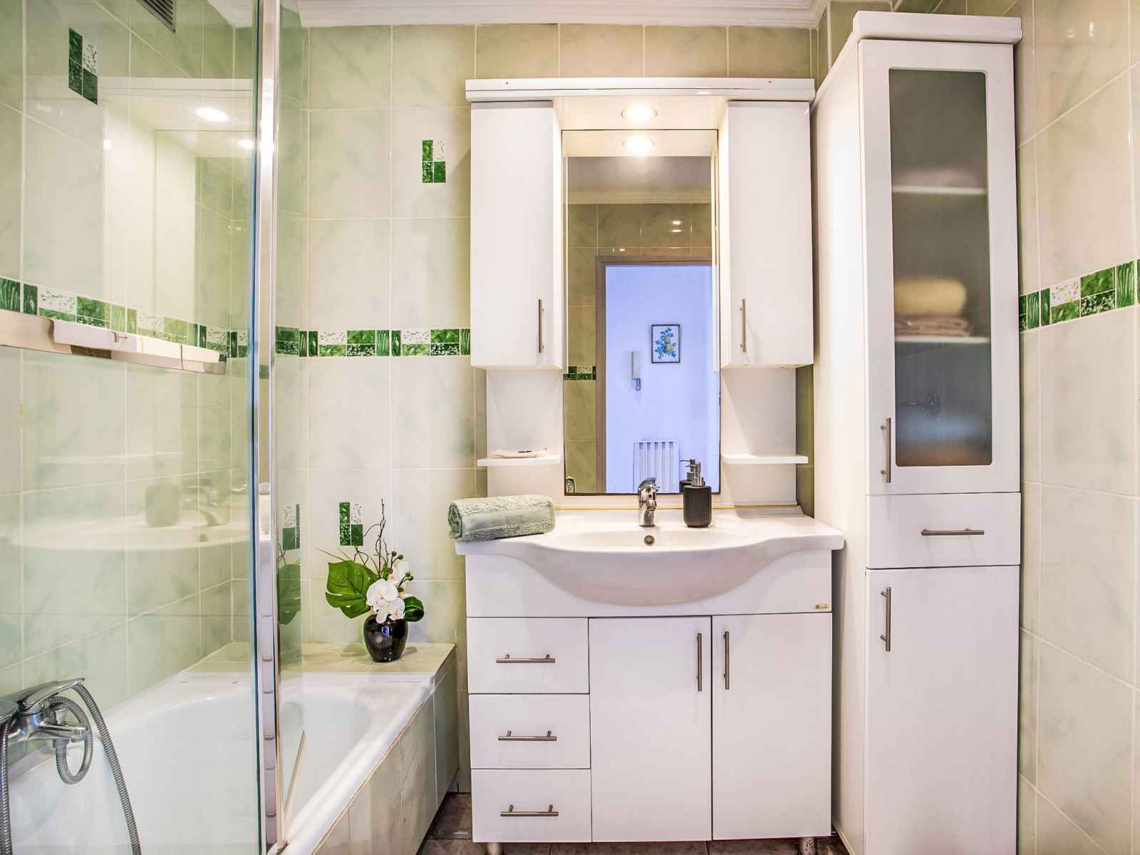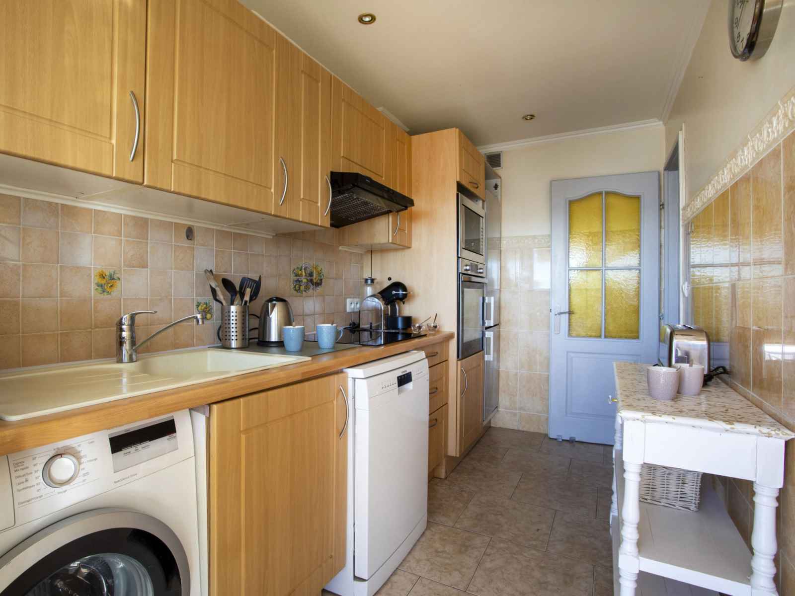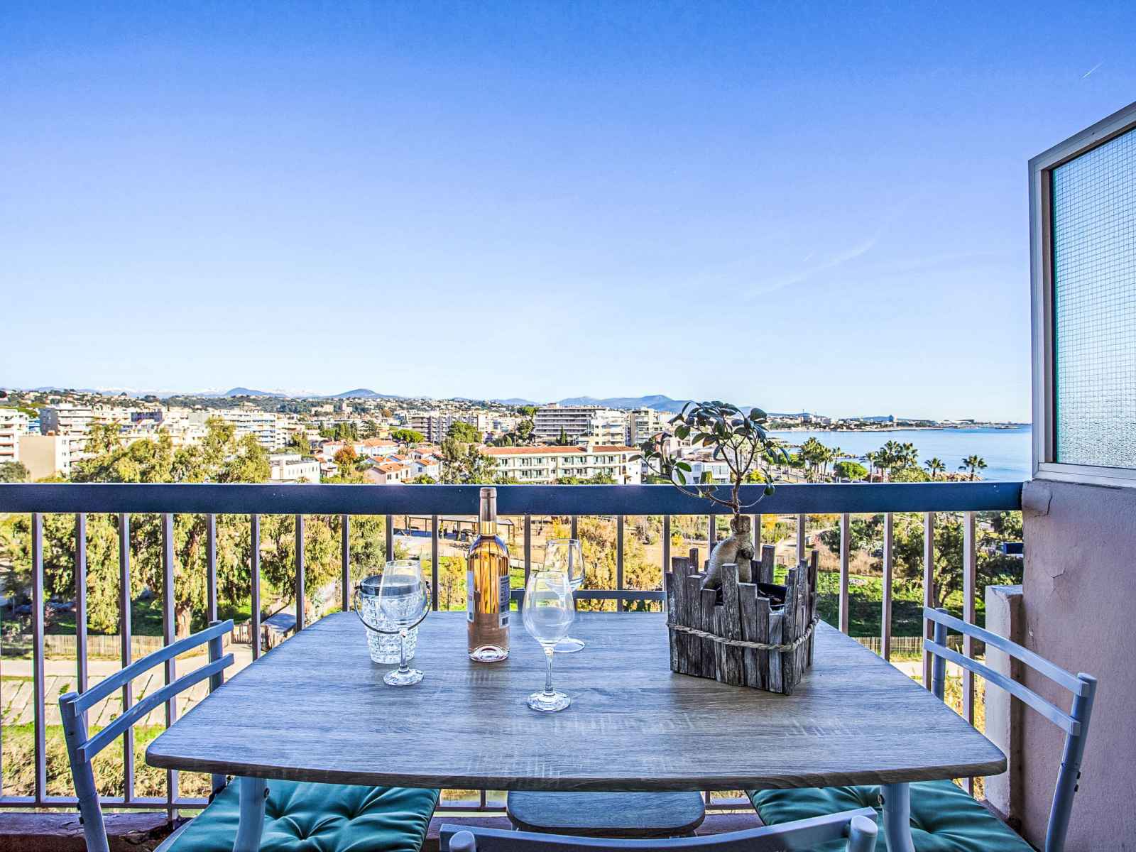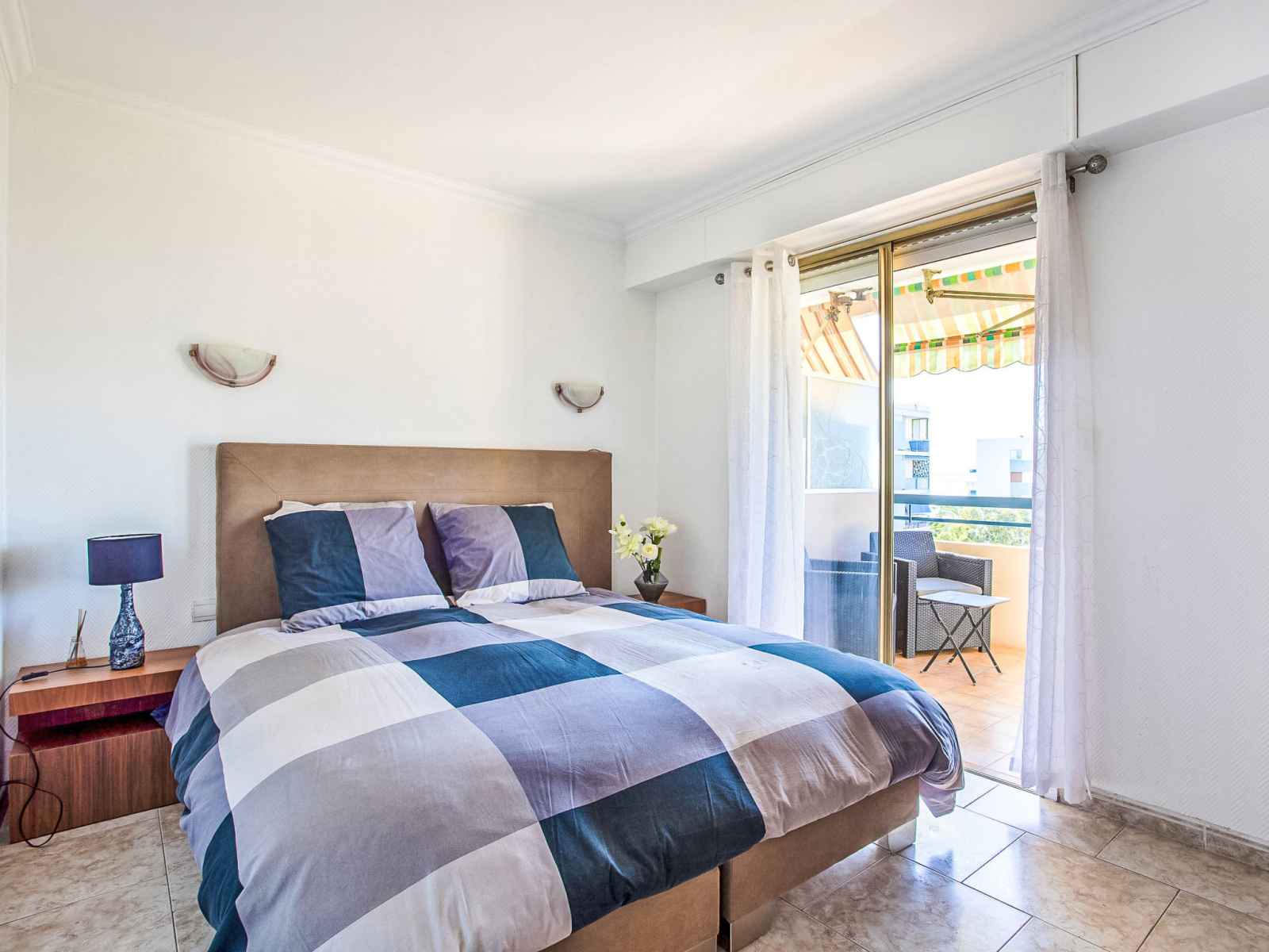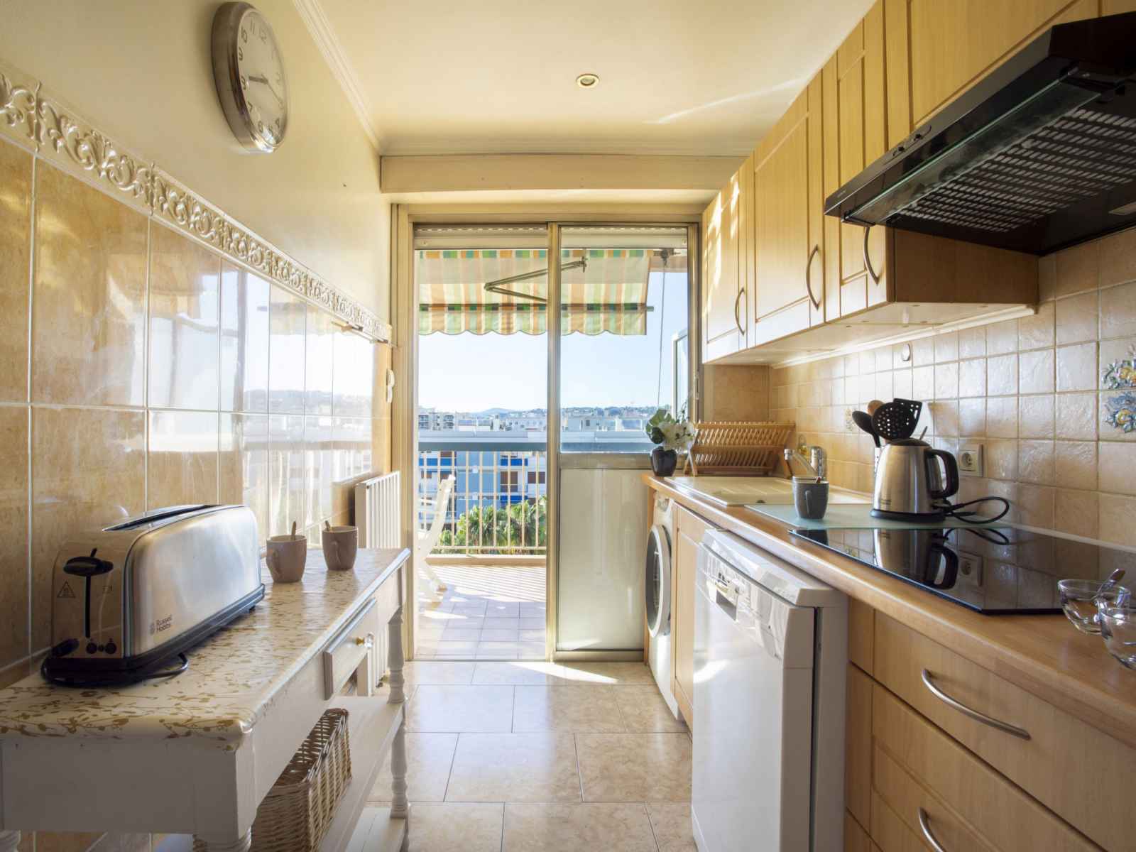 Apt 2 pièces 50 m2 au 5ème étage. aménagement confortable: séjour/salle à manger avec 1 divan-lit double (1 x 140 cm, longueur 190 cm), air-conditionné. sortie sur la terrasse. 1 chambre avec 1 grand-lit (1 x 160 cm, longueur 200 cm). sortie sur la terrasse. cuisine (3 plaques de cuisson, four, lave-vaisselle, grille-pain, bouilloire