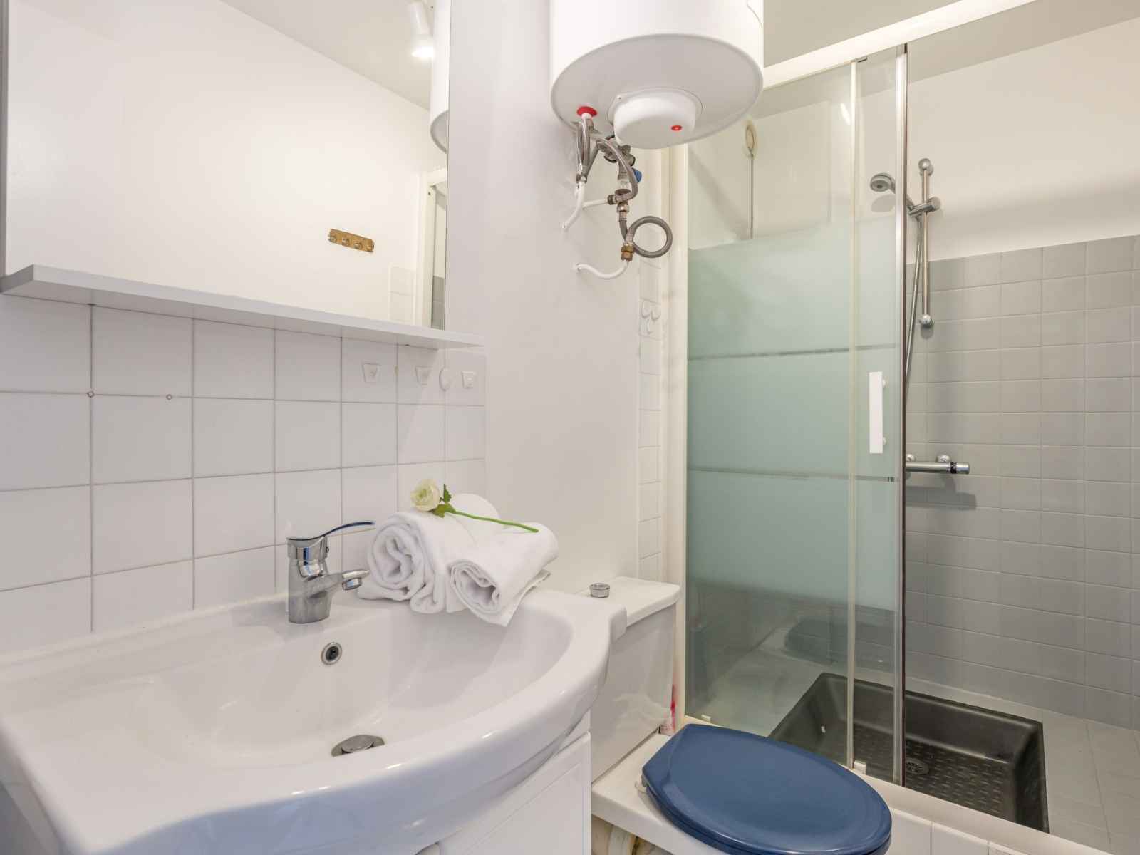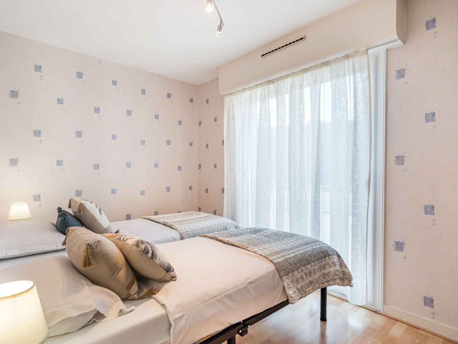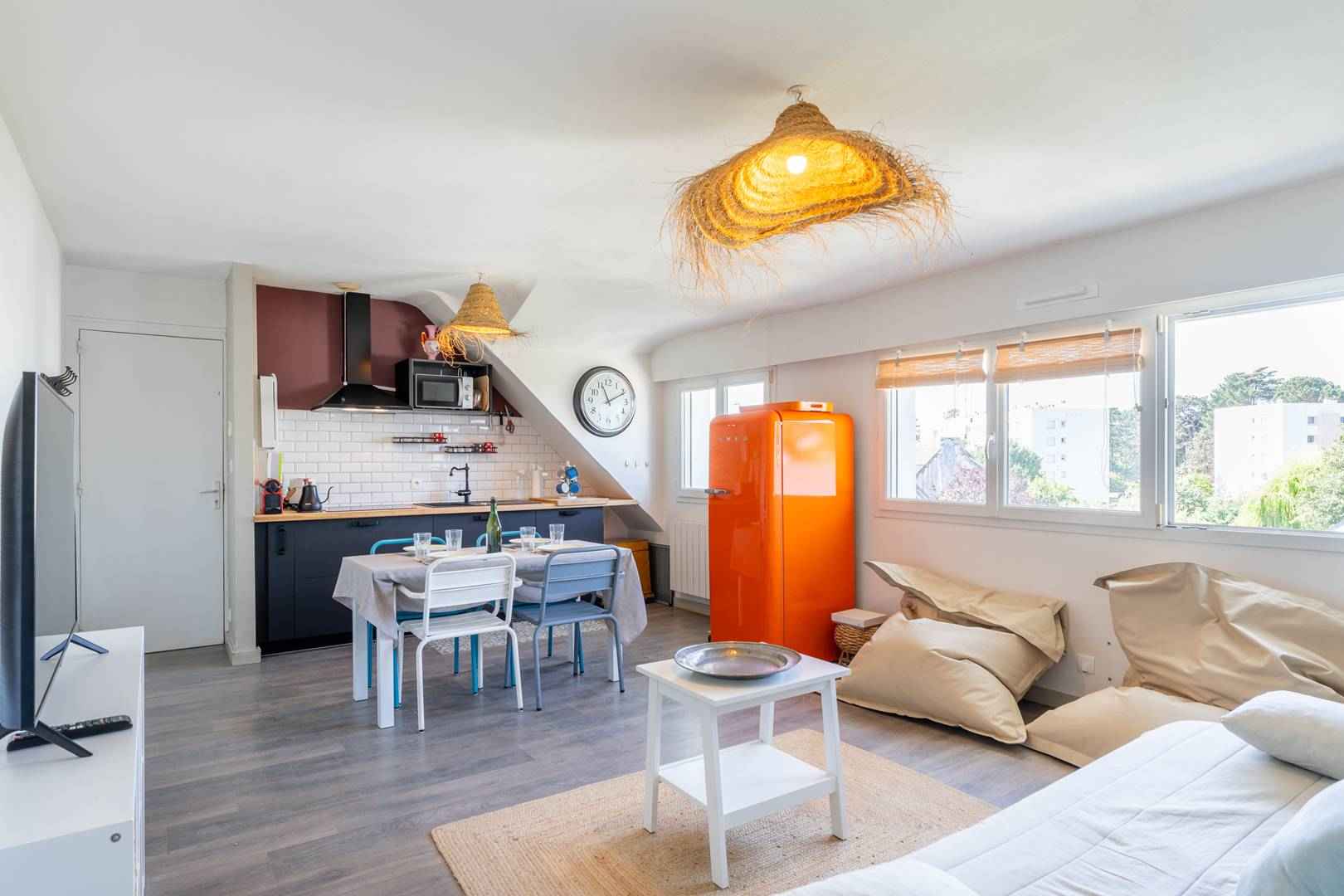 Apt 2 pièces 28 m2 au 1er étage. séjour/salle à manger avec 1 divan-lit double (1 x 140 cm, longueur 190 cm), tv (écran plat). sortie sur le balcon. 1 chambre avec 2 lits (80 cm, longueur 190 cm). cuisine ouverte (lave-vaisselle, 2 plaques vitrocéramiques, grille-pain, bouilloire électrique, micro-ondes, cafetière électrique). douche/wc.