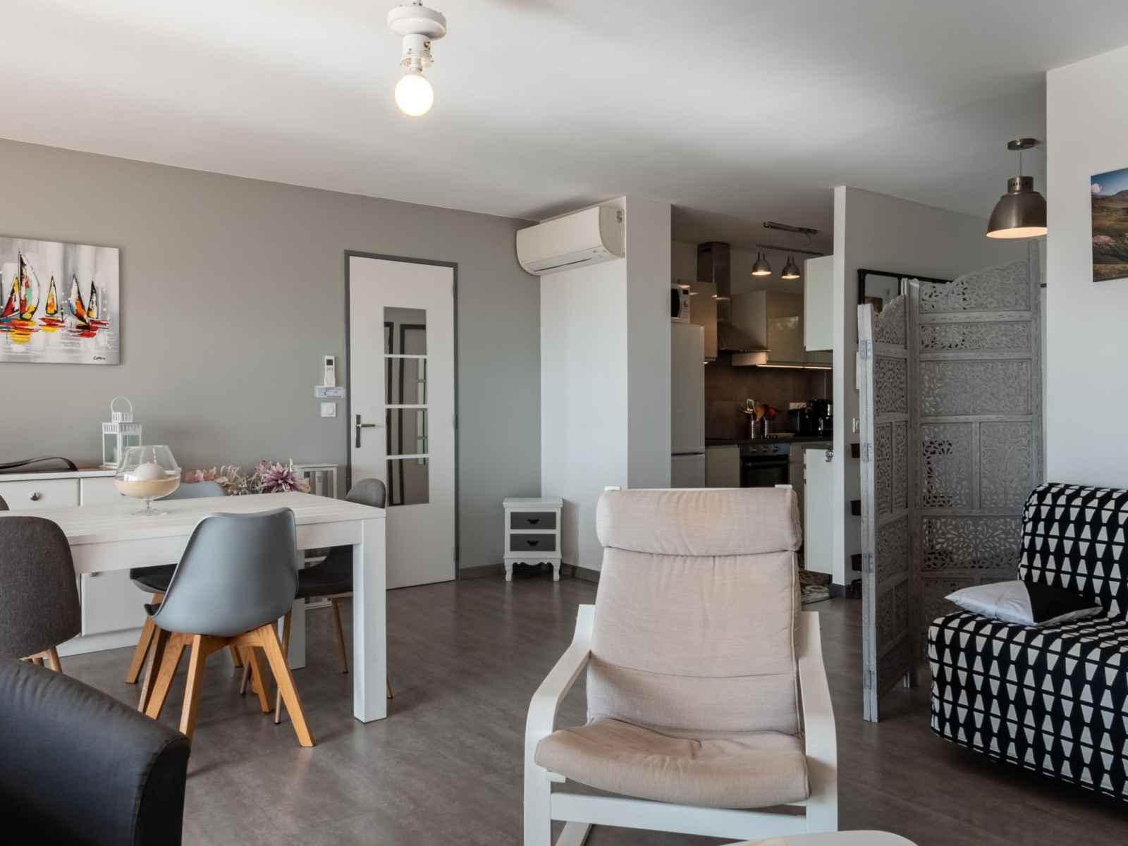 Apt 2 pièces 60 m2 au 2ème étage. complètement rénové en 2020, aménagement moderne et de bon goût: séjour avec baie vitrée avec 1 divan-lit (140 cm, longueur 190 cm), tv (écran plat), air-conditionné et volet roulant électrique. sortie sur la terrasse. 1 chambre avec 1 grand-lit (160 cm, longueur 200 cm), air-conditionné. coin