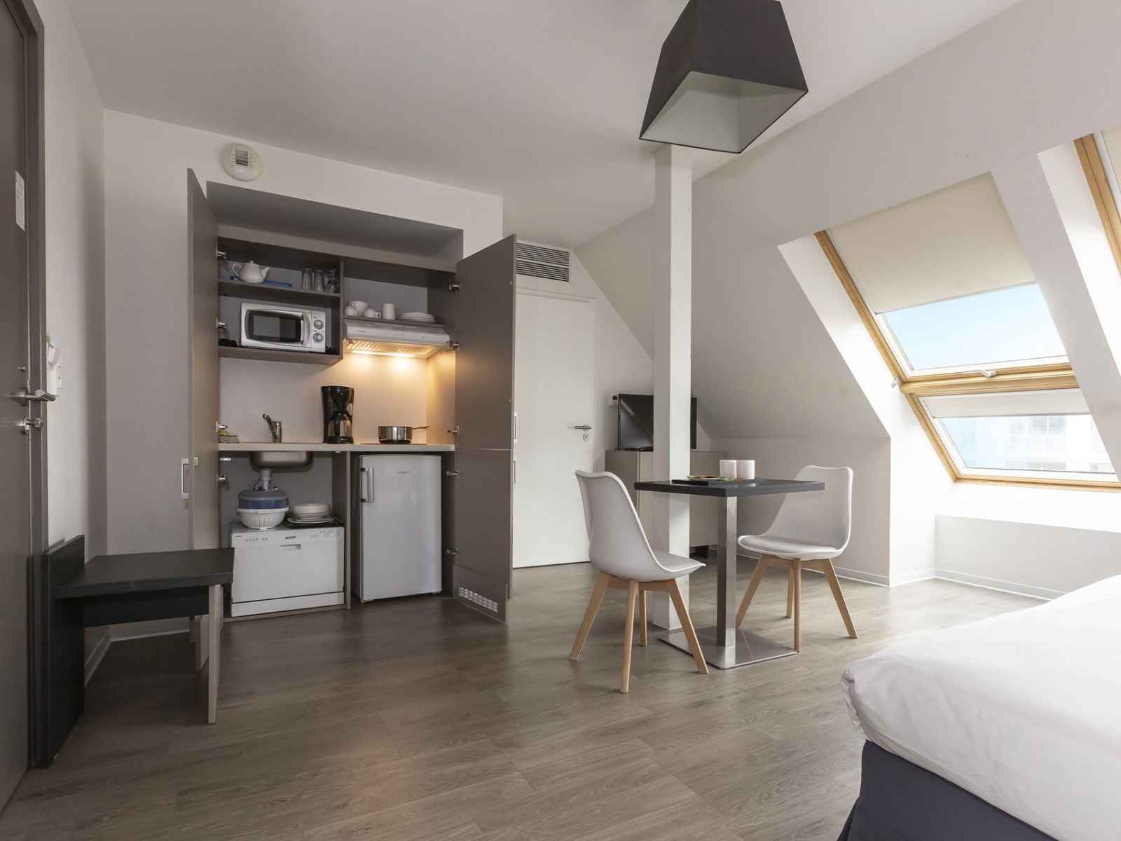 kitchenette équipée (plaque vitrocéramique, hotte, lave-vaisselle, micro-ondes combiné, réfrigérateur)