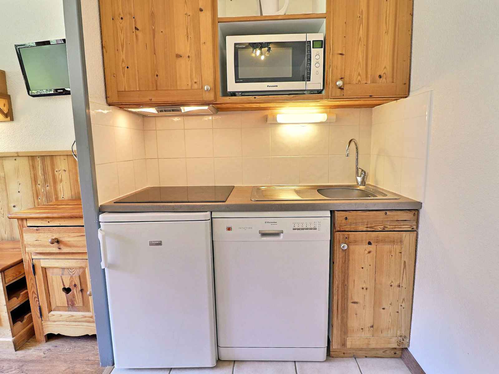 kitchenette : frigidaire, 4 plaques vitrocéramiques, lave-vaisselle, four combiné micro-ondes, hotte,