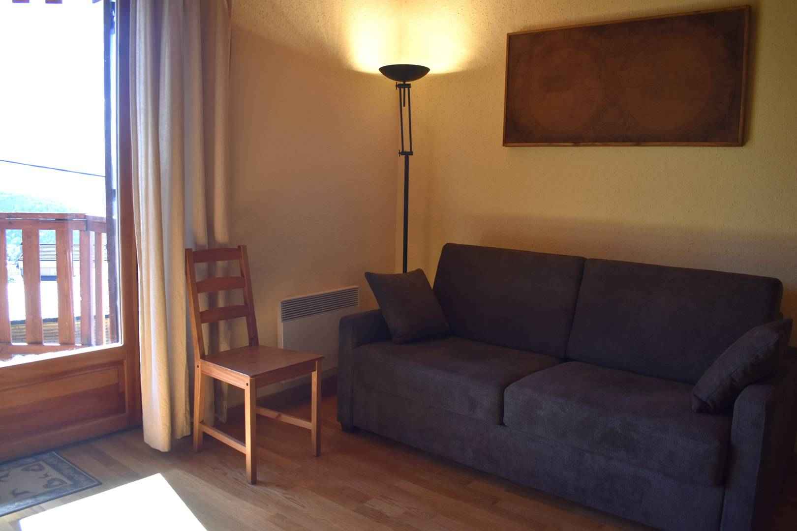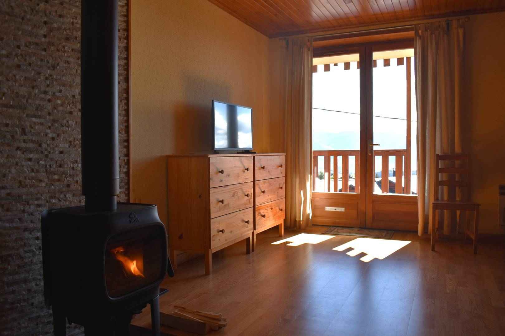 Salon/Séjour : Coin TV avec un canapé convertible 2 personnes, exposition plein sud. Un poêle à bois qui vient compléter cet espace pour des soirées au coin du feu.