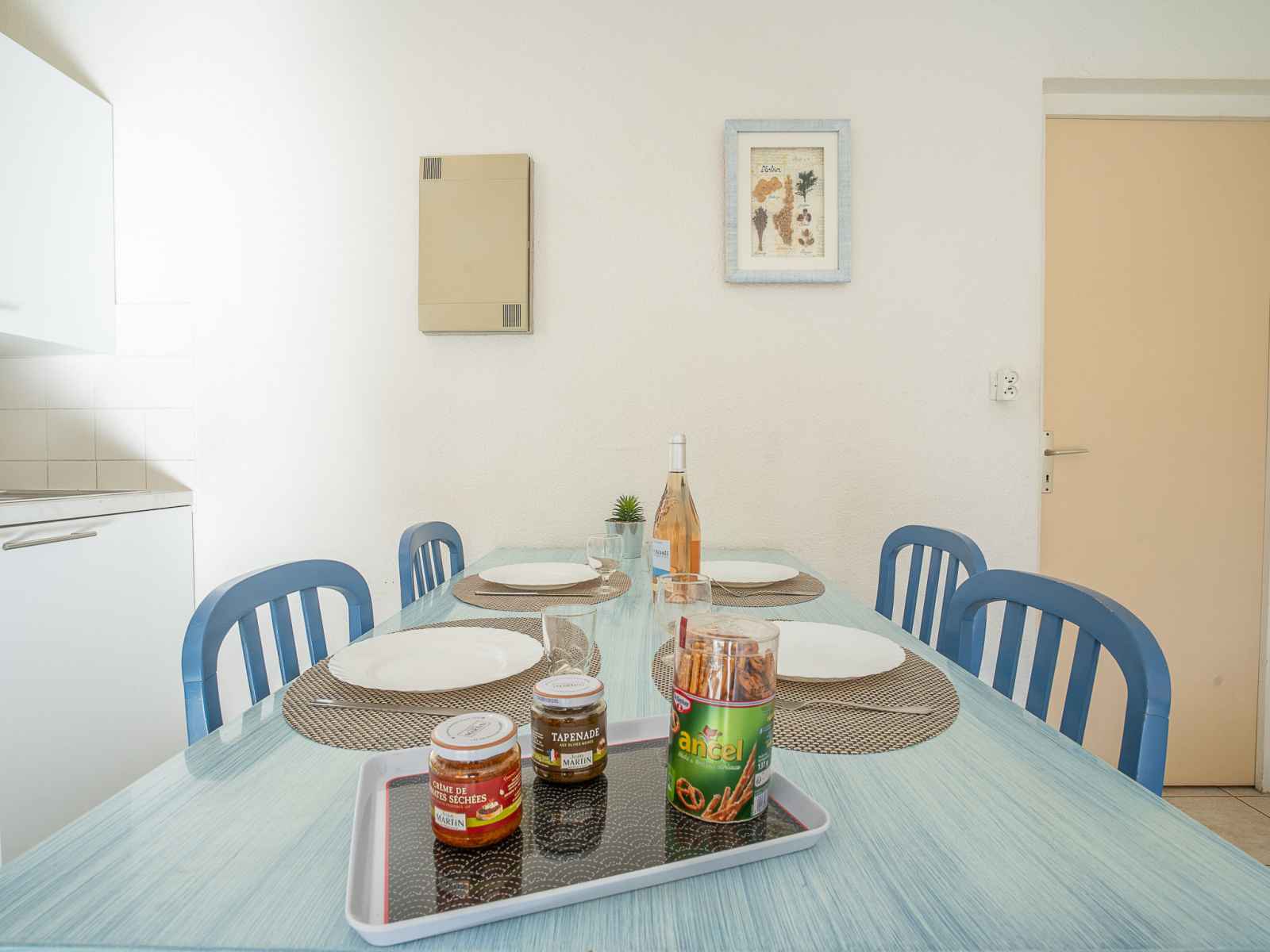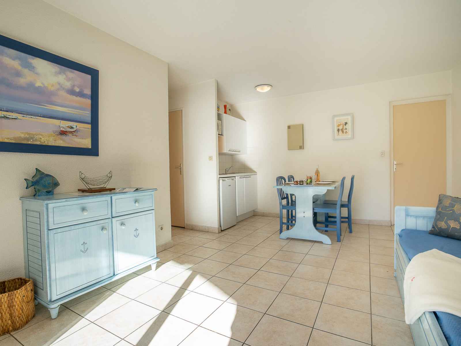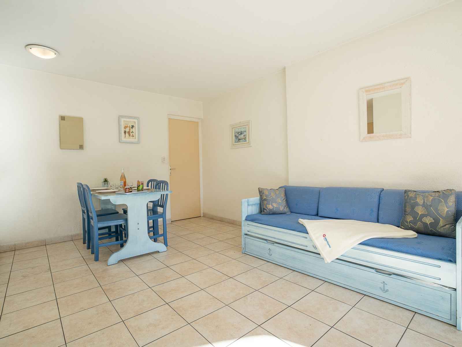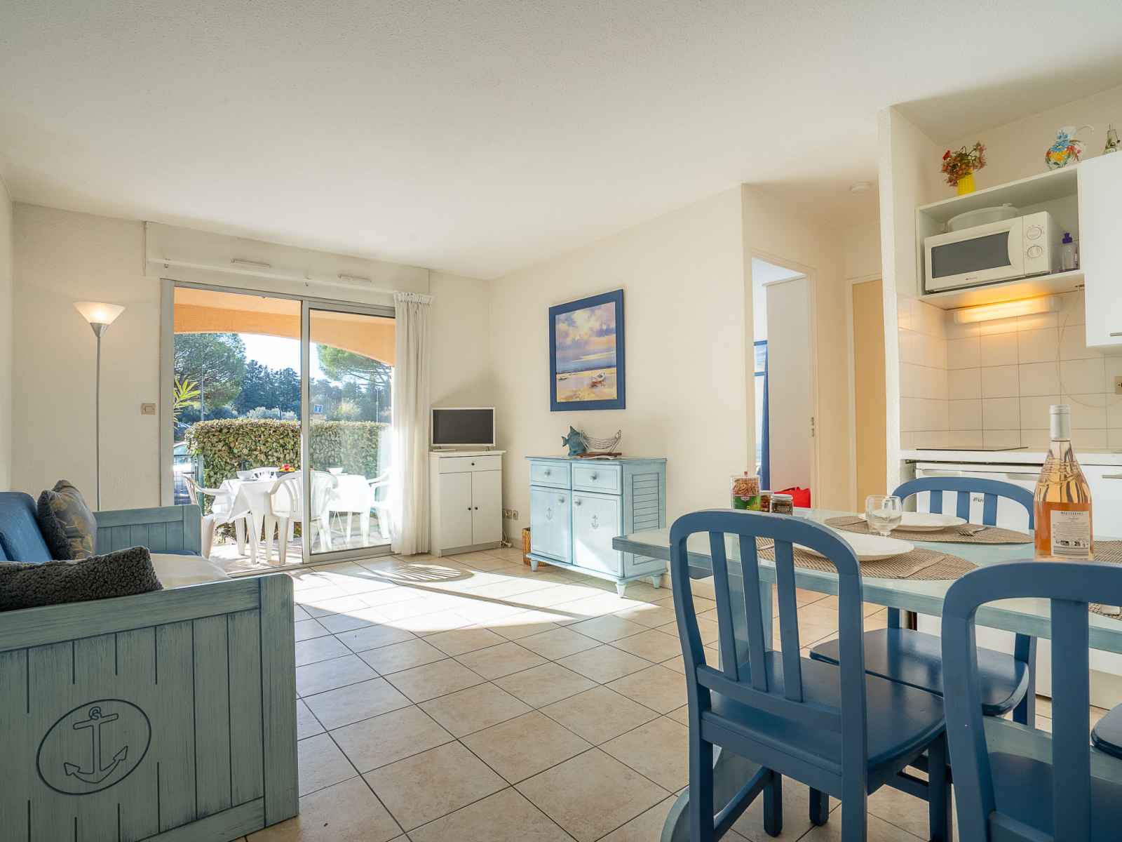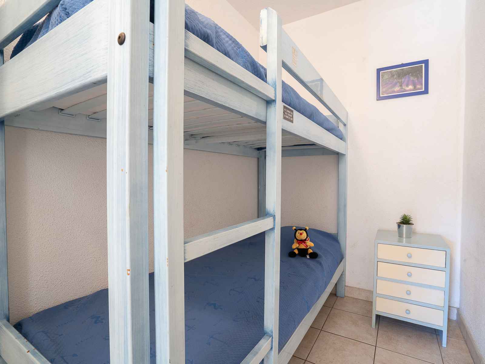 Apt 2 pièces 35 m2, au rez-de-chaussée. aménagement fonctionnel: séjour/salle à manger avec 1 lit (80 cm), coin repas, tv et air-conditionné. sortie sur la terrasse. 1 chambre avec 1 grand-lit (1 x 140 cm, longueur 190 cm). cabine, sans fenêtre avec 1 x 2 lits superposés (80 cm, longueur 190 cm). coin cuisine (2 plaques vitrocéramiques,