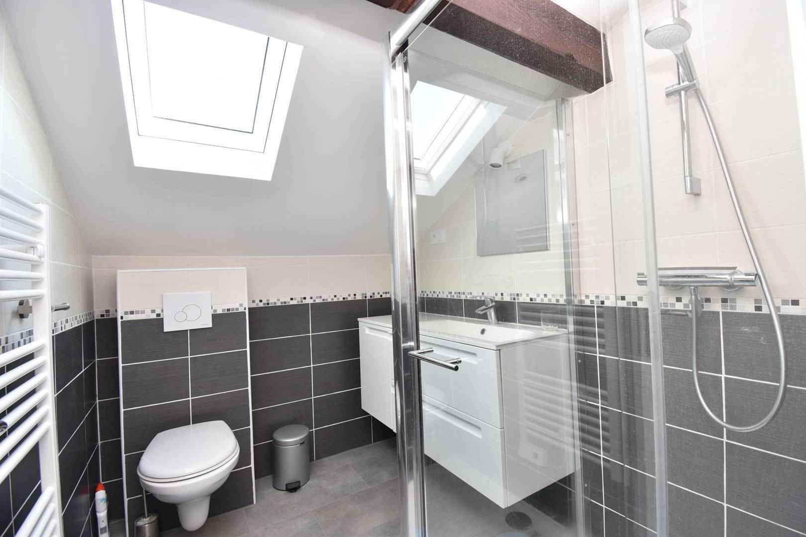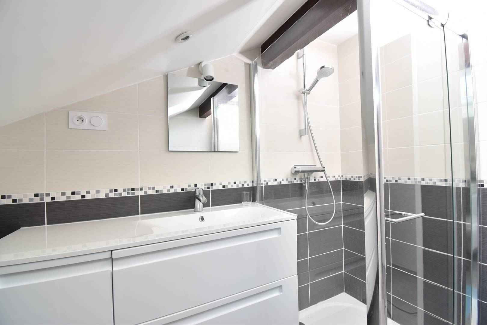 - Salle de bains (Il y a une douche-cabine avec des portes en verre, un grand meuble vasque et un wc.)