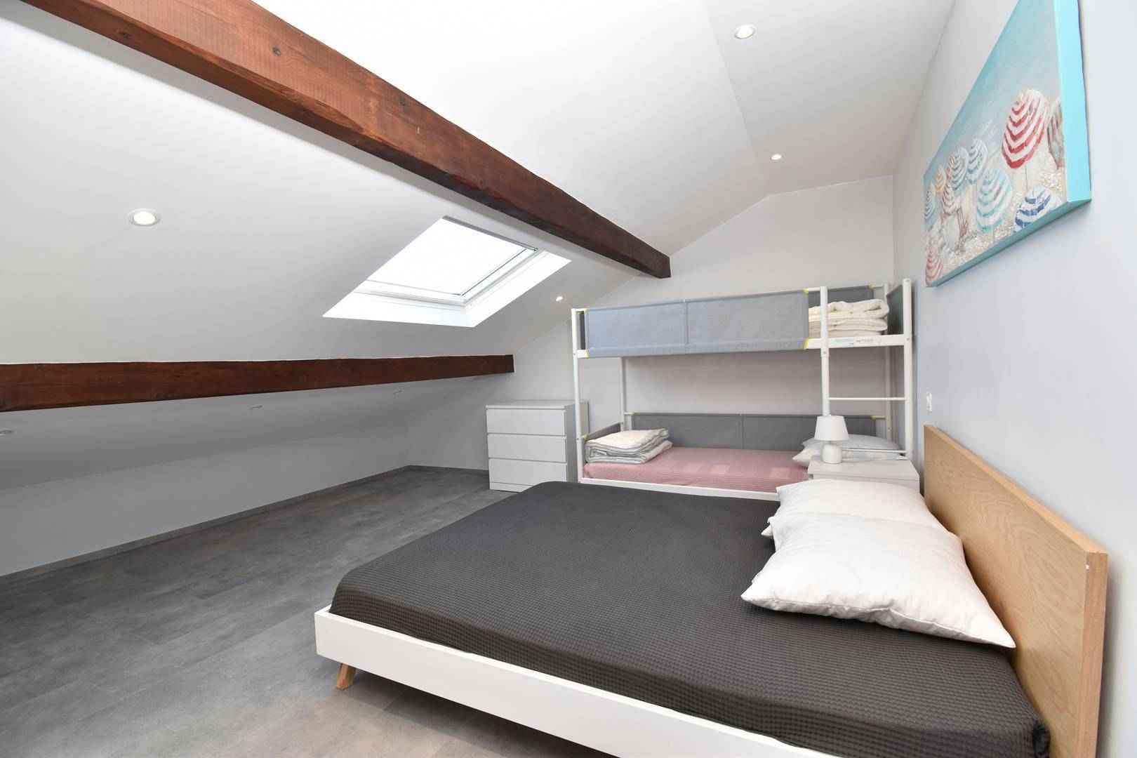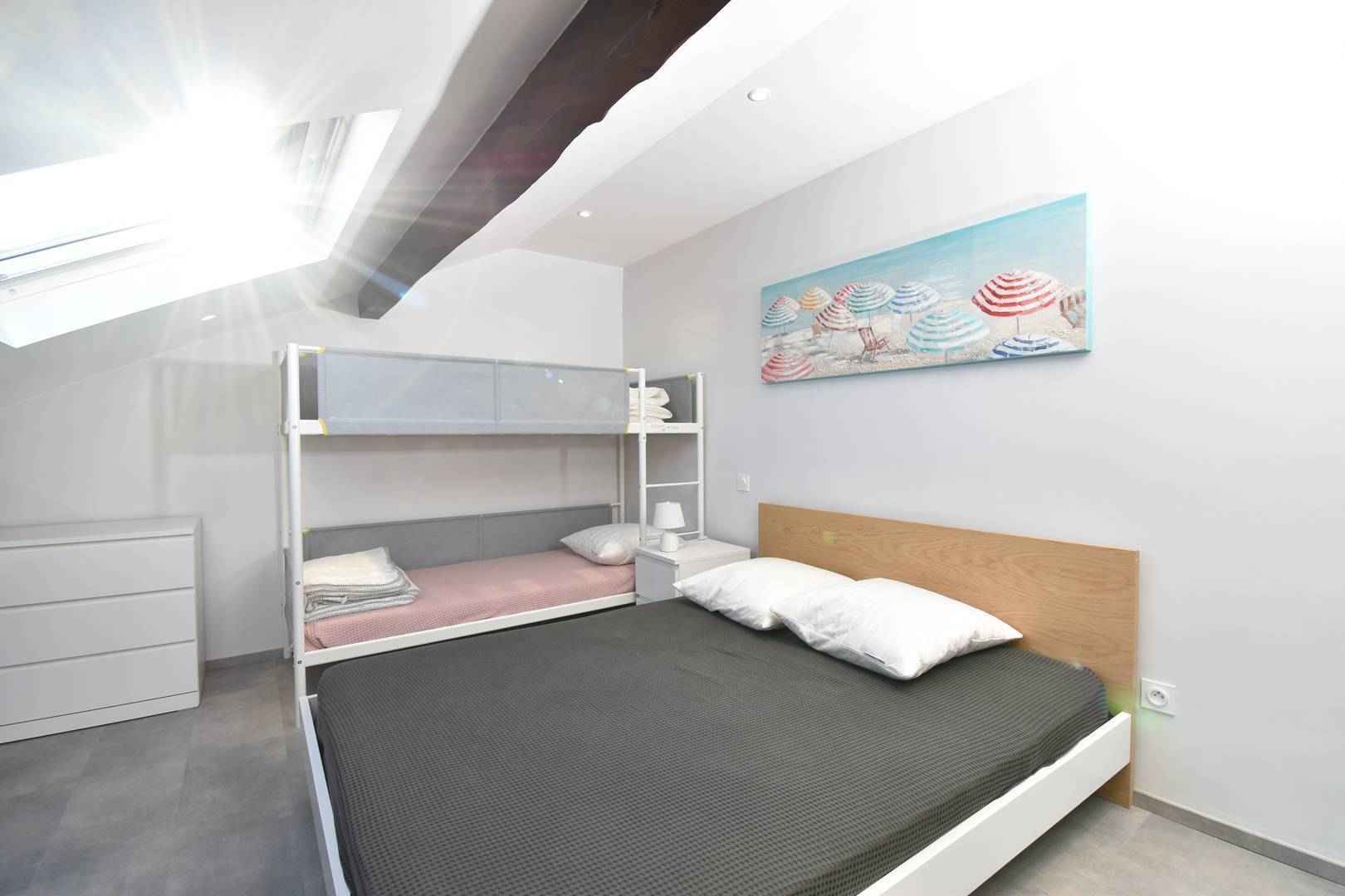 - Chambre (Elle possède un lit double et des lits superposés.)