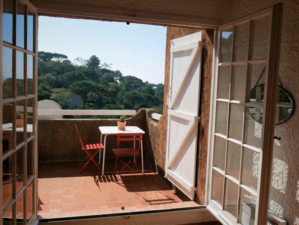 Bel appartement climatisé 2 pièces , vue mer, au 1° et dernier étage dans une résidence sécurisée de style provençal avec piscine, calme et résidentielle, exposition sud, 50 m2, plages de gigaro à 1500m, piscine et tennis à 500m