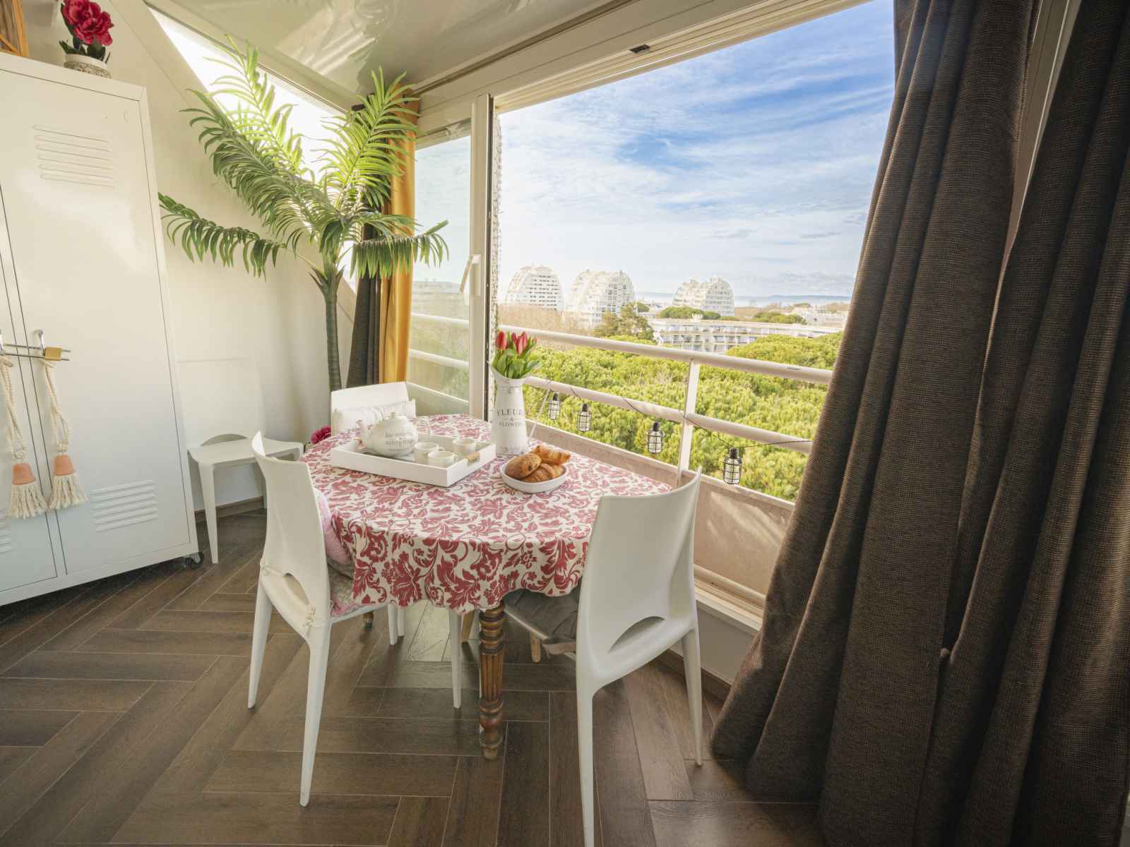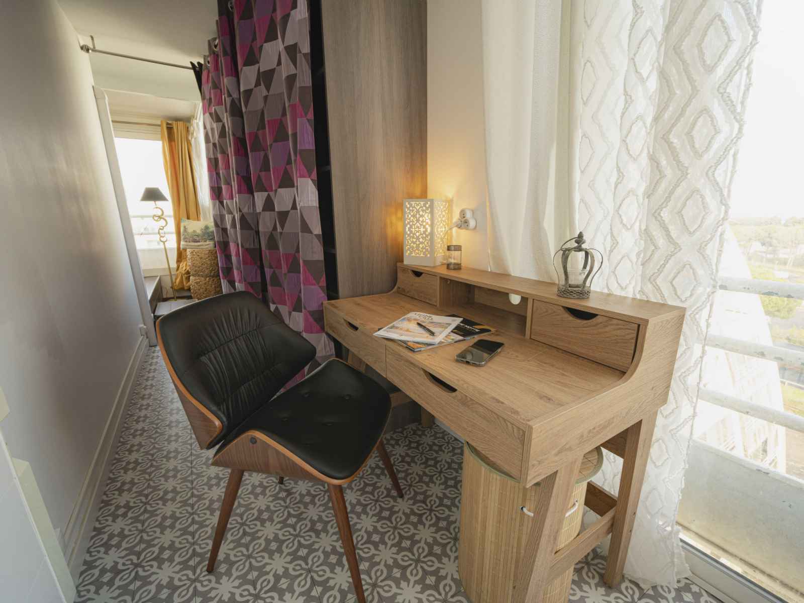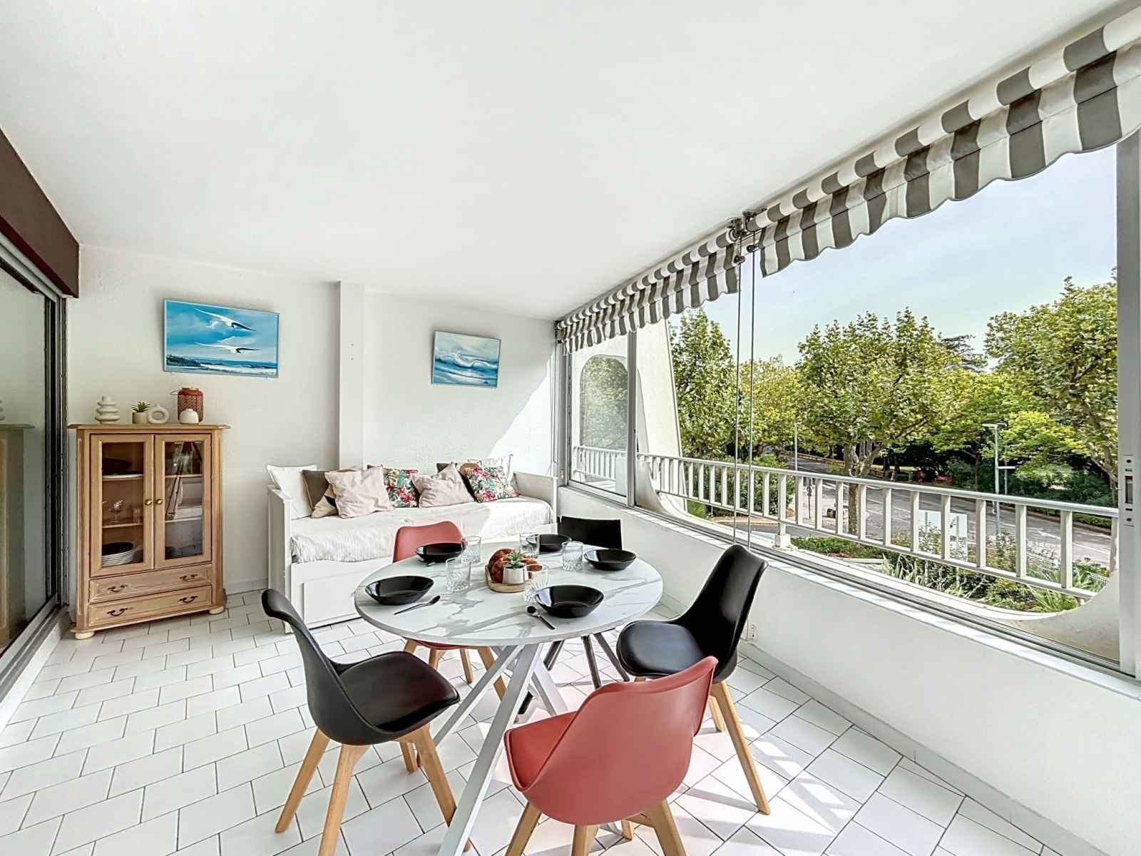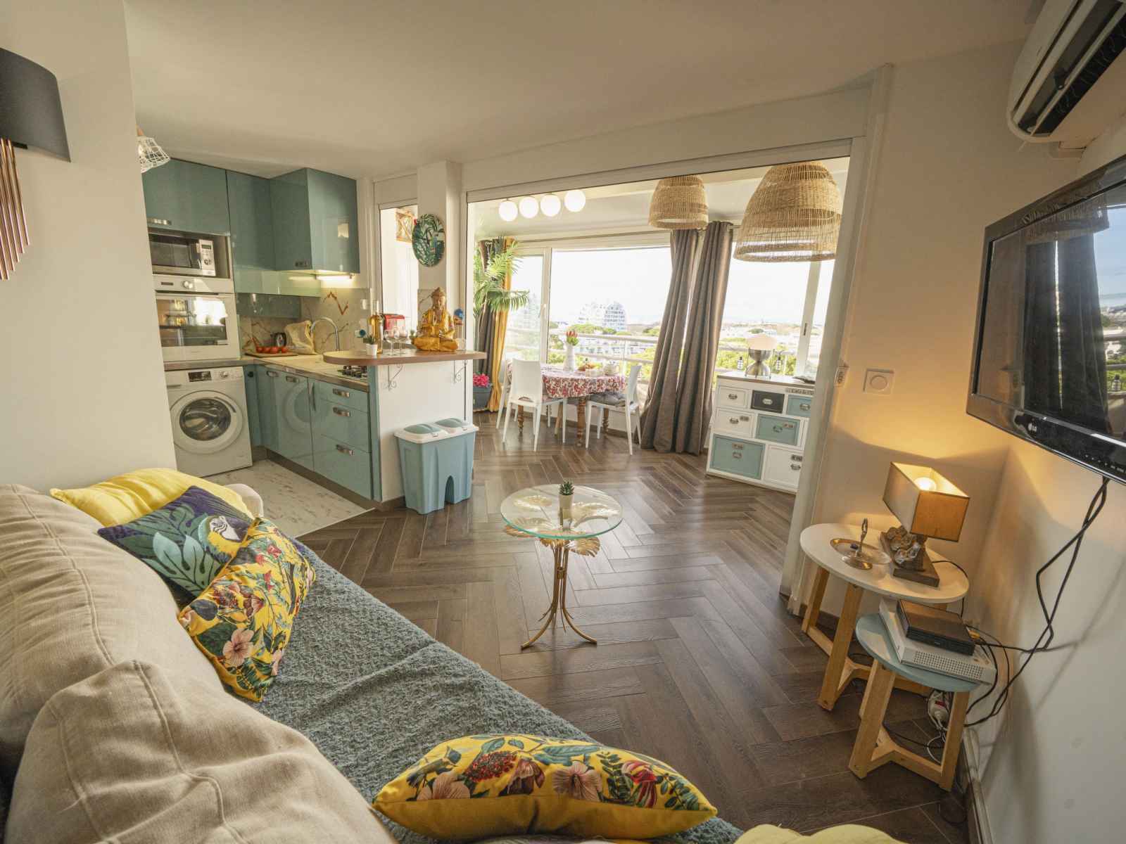 Apt 2 pièces 45 m2 au 7ème étage. aménagement agréable: séjour/salle à manger avec tv (écran plat). 1 chambre orientée sud, fenêtre donnant sur le séjour avec 1 grand-lit (1 x 140 cm, longueur 190 cm). pièce en enfilade avec 1 divan-lit double (120 cm, longueur 190 cm). coin cuisine (four, lave-vaisselle, 4 feux, grille-pain,