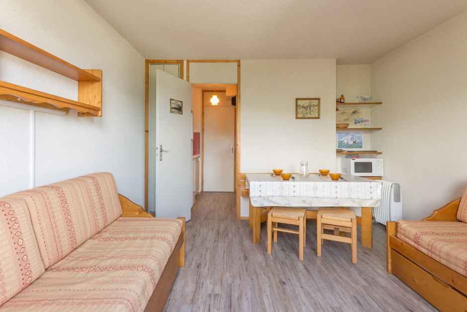 lave-vaisselle, frigo, four, micro-onde, cafetière électrique), d'une salle de bain avec baignoire et WC séparé. Le salon dispose d'un lit pour 2 personnes et d'un lit simple. Dans la chambre vous disposez d'un ensemble lits superposés (interdit aux enfants de moins de 6 ans). Pour votre confort vous disposez d'une télévision écran plat. Casier à skis au rez de chaussée. Ses atouts: - Son emplacement en plein coeur de station - Cuisine indépendante et bien équipée - Couettes Linge et ménage de fin de séjour en suppléments. Appartement non fumeur. Animaux refusés.