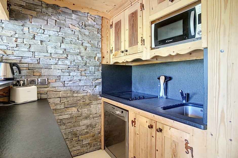 pièce principale avec cuisine incorporée 4 plaques, réfrigérateur, four micro-ondes, lave vaisselle, bouilloire, cafetière et grille-pain. télévision