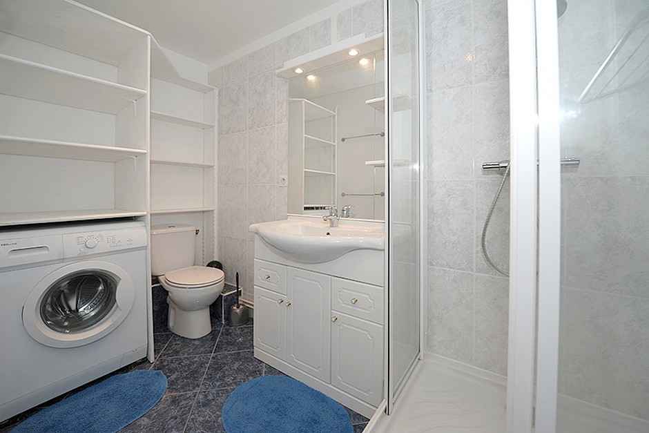 douche, WC et machine à laver. Cuisine incorporée 4 plaques vitrocéramiques et hotte, four, four micro-ondes, grand réfrigérateur et congélateur, lave vaiselle, grille-pain, bouilloire et cafetière Senseo Sol parquet dans tout l'appartement Appartement non fumeur Animaux refusés Appartement équipé de couettes Le couchage en hauteur ne convient pas à des enfants de moins de 6 ans.
