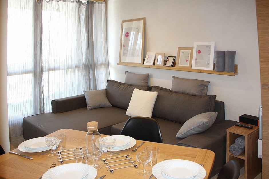 gratuit et illimité. Chambre (séparée du séjour par cloison coulissante) : 2 lits 1 personne. Cabine (séparée du séjour par une porte) : 2 lits 1 personne superposés. Equipée d'une télévision. Les chambres sont toutes équipées de prises USB. Chargeur de téléphone intégré aux prises. Cuisine équipée de 4 plaques induction, réfrigérateur, four traditionnel, micro-ondes, lave-vaisselle, cafetière, grille-pain et bouilloire. Salle d'eau avec douche. WC indépendant. Sol carrelage et plastique dans tout l'appartement. Appartement non fumeur. Animaux non admis. Appartement équipé de couvertures