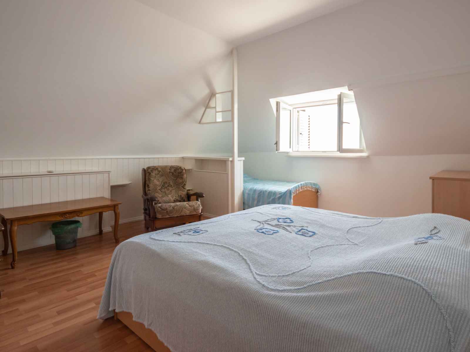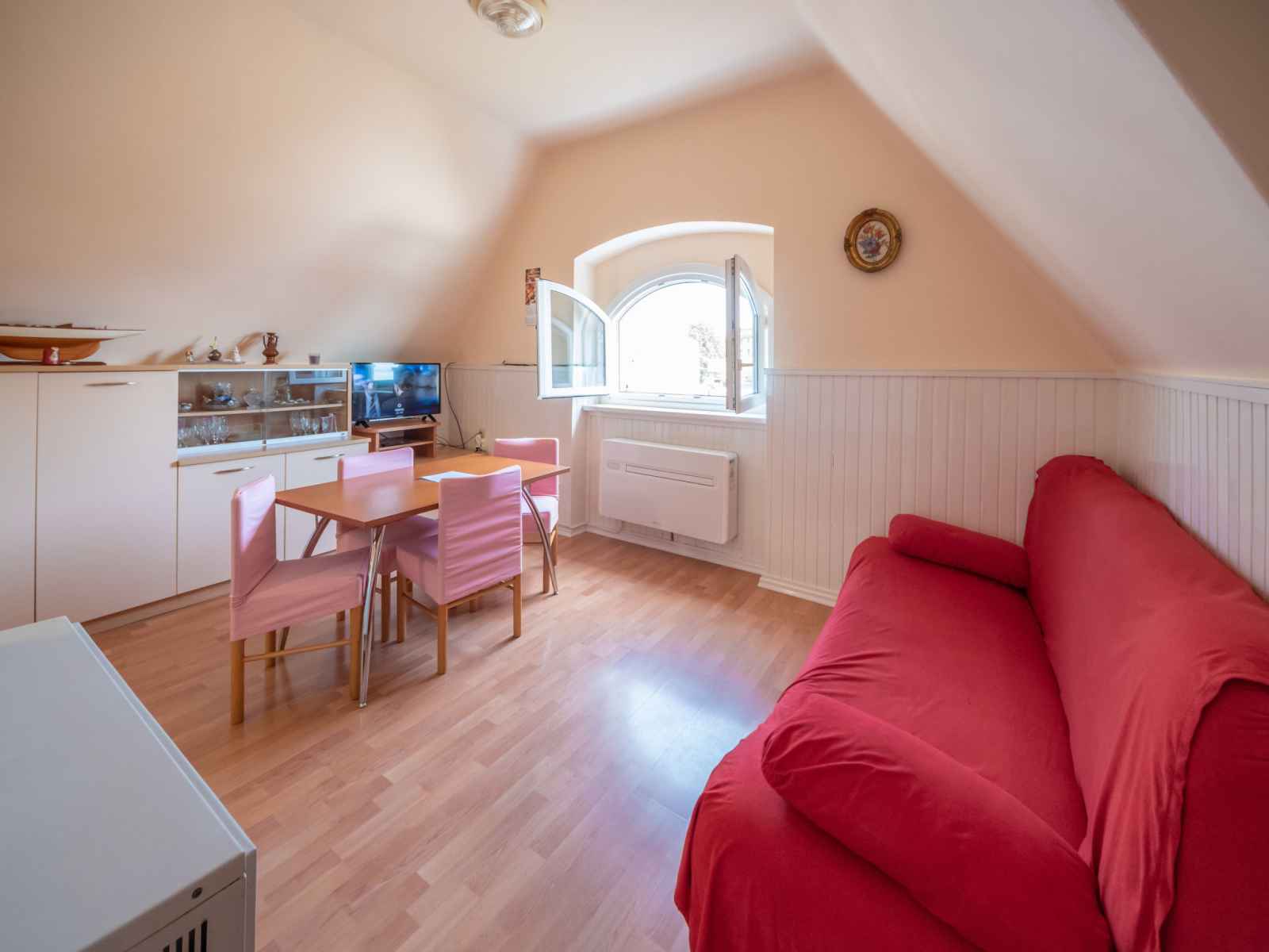 Apt 2 pièces 58 m2, sous le toit, situation sud-est. séjour/salle à manger 12 m2 avec tv (satellite), dvd et air-conditionné. 1 chambre 26 m2 avec 1 lit, 1 lit double et air-conditionné. cuisine ouverte (4 plaques de cuisson, four, micro-ondes). douche/wc. chauffage (en sus), air-conditionné (en sus). vue sur la mer. a disposition: