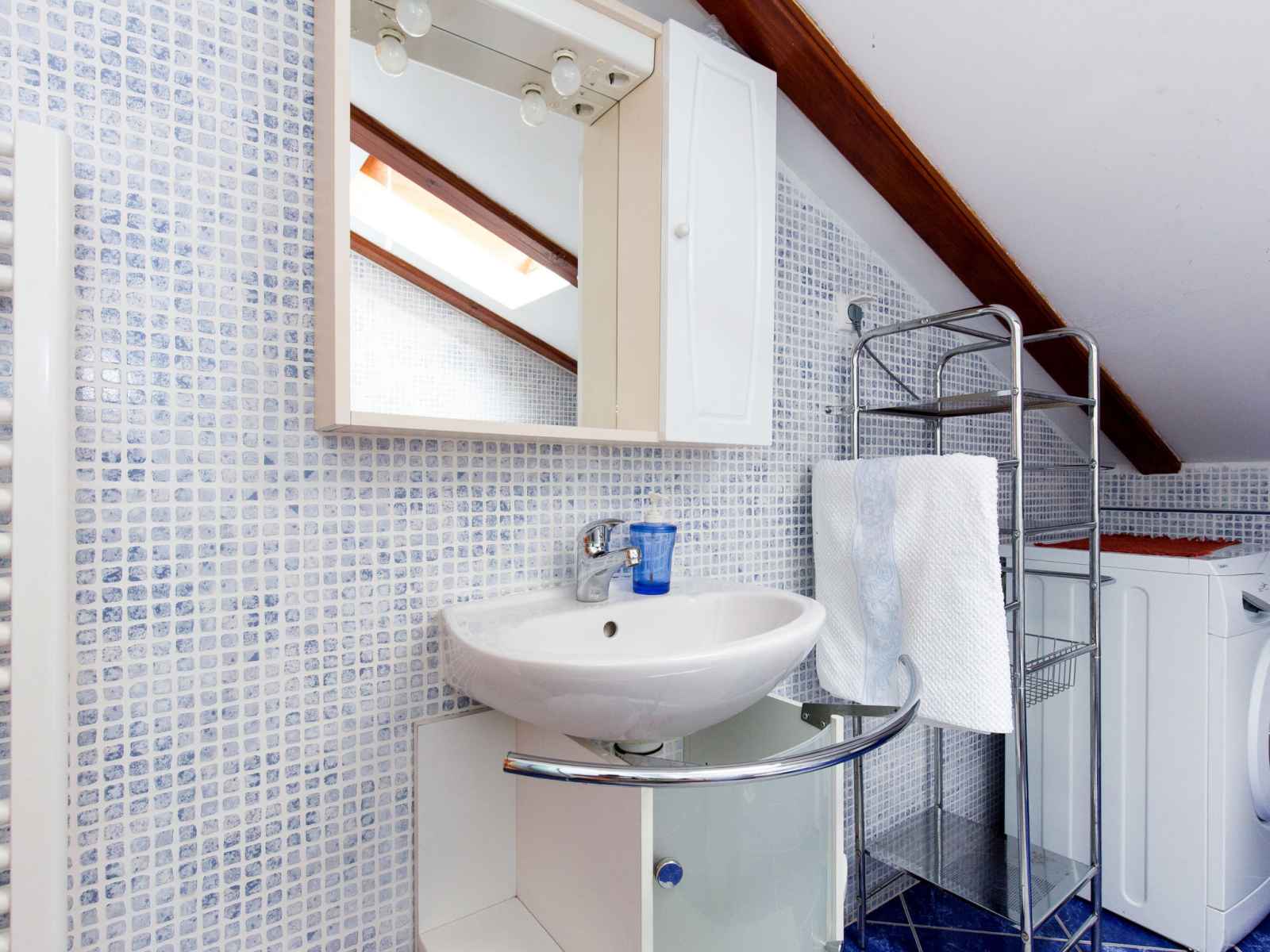 "teodora", apt 2 pièces 40 m2, sous le toit. séjour/salle à manger mansardé hauteur plafond 80 - 220 cm avec fenêtre sous le toit avec 1 divan-lit, tv (satellite) et air-conditionné. sortie sur la terrasse. 1 chambre mansardée hauteur plafond 80 - 220 cm avec 1 lit et 1 lit double. cuisine ouverte (2 plaques de cuisson, grille-pain,