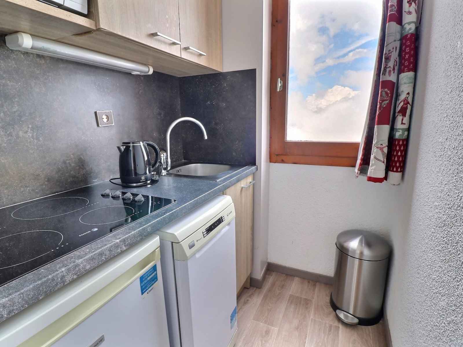 kitchenette (séparée par porte coulissante) : petit micro-ondes grill, frigidaire, 4 plaques vitro-céramiques,
