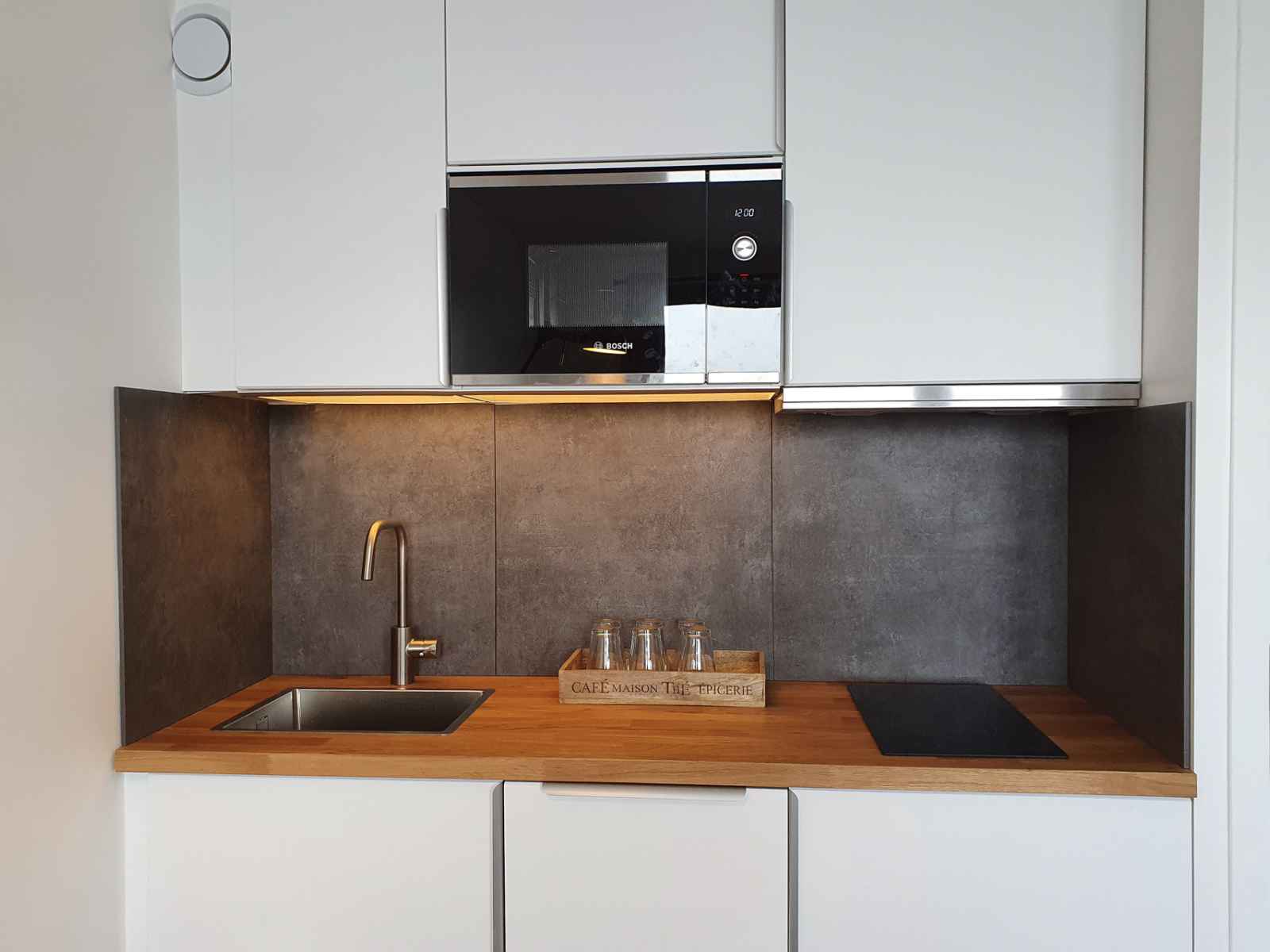 cuisine : combiné four micro-ondes, frigidaire, 2 plaques vitro céramiques, lave-vaisselle, cafetière à filtre, grille pain,