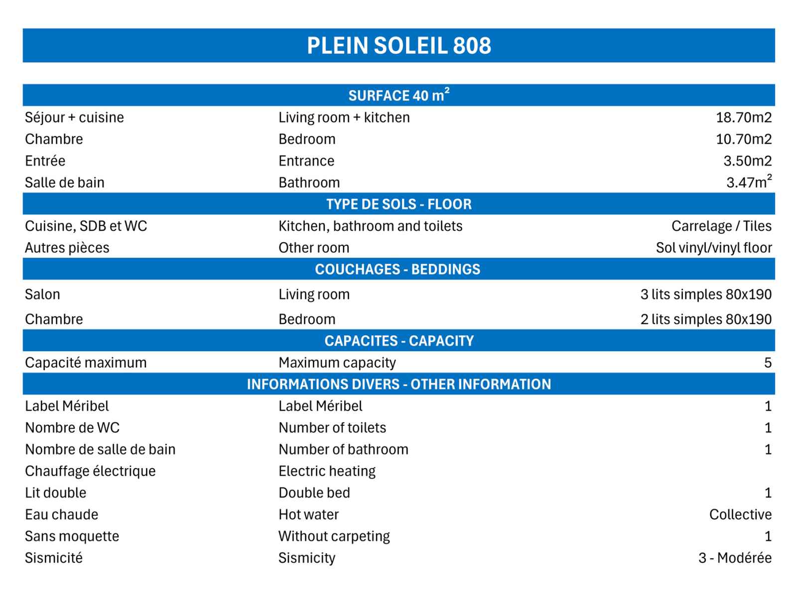 - Caution 350 € (CB ou chèque détruit au plus tard 14 jours après votre départ)