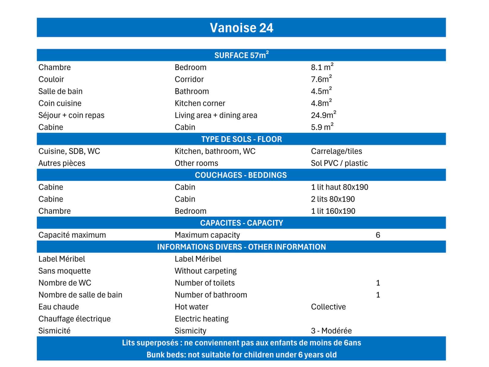cabine : 2 lits simples (80x190) et 1 lit superposé (80x190)