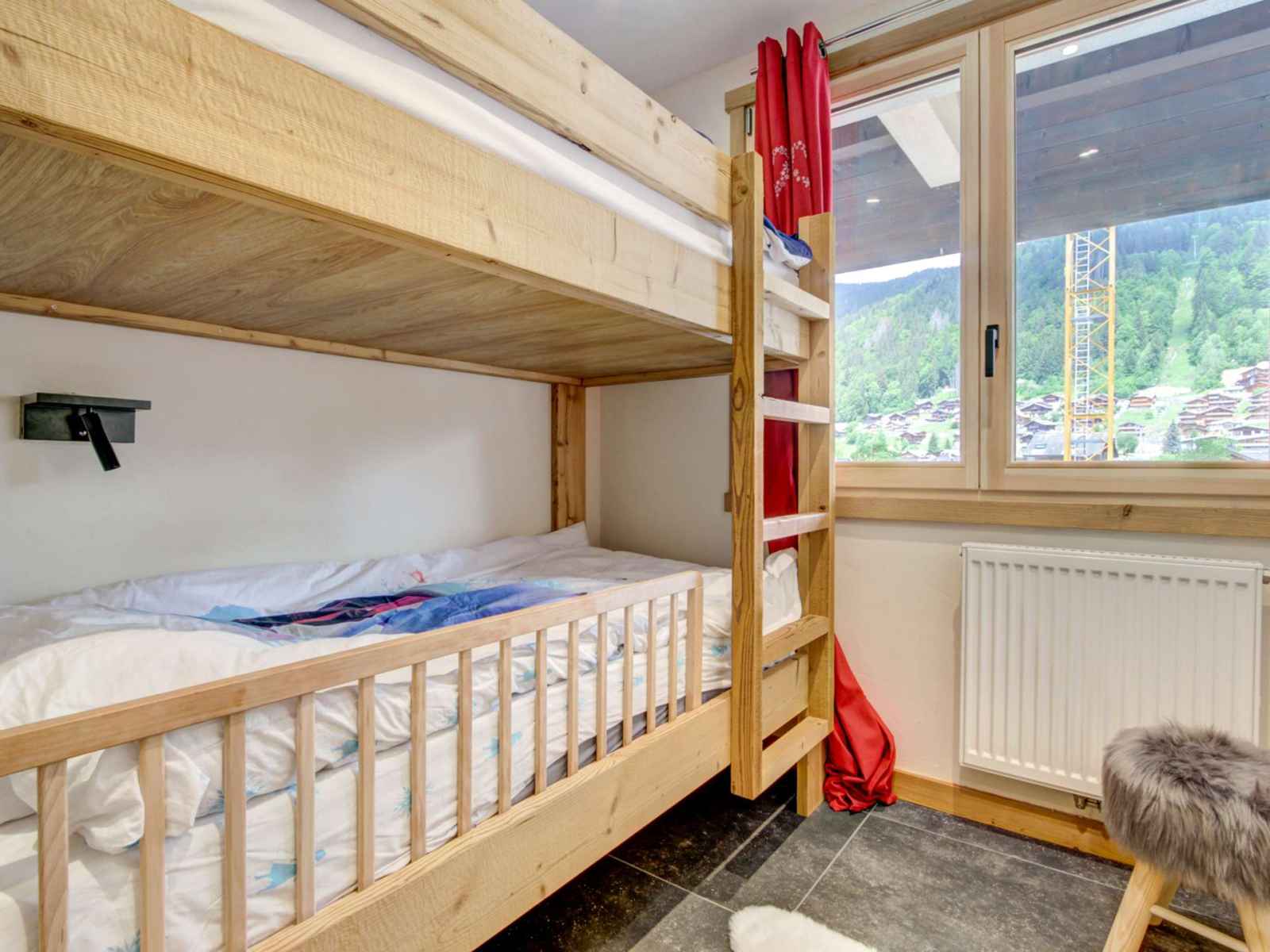 douche et WC, une chambre parentale avec lit double 160x200, placards, TV écran plat au mur, une chambre enfants avec lit superposés 90x190cm, un salon avec cuisine ouverte (lave vaisselle / four/ micro ondes) donnant sur balcon. Table extensible 4 à 6 personnes, Canapé lit, TV écran plat au mur.