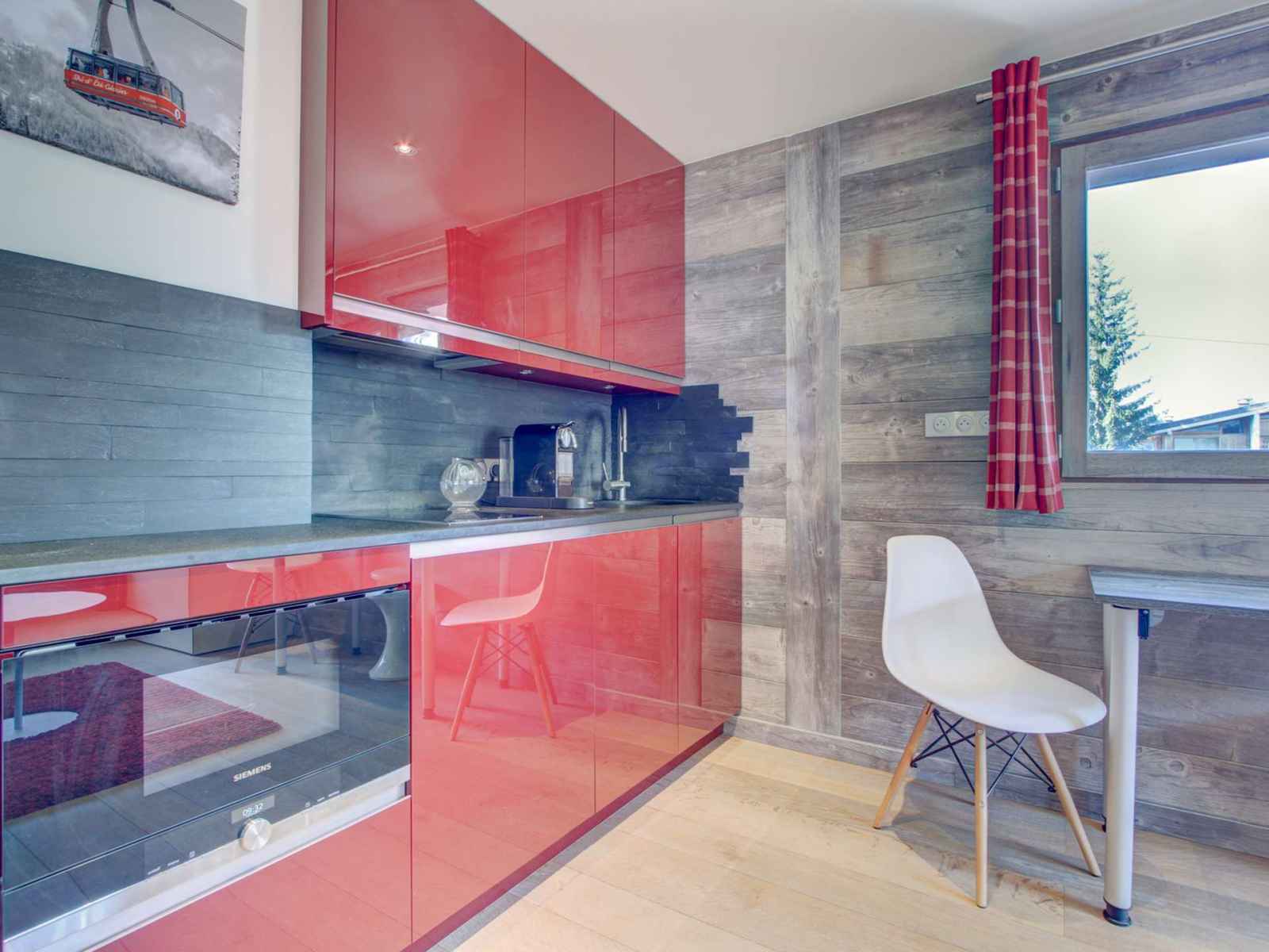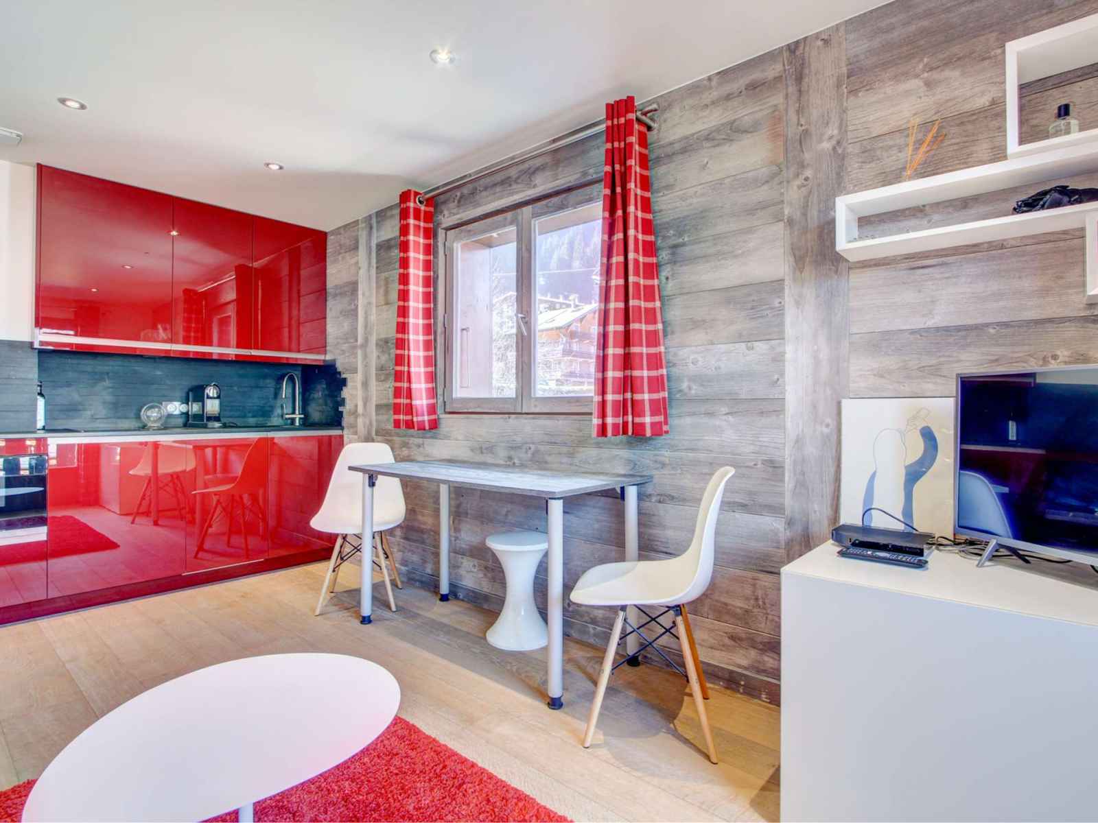 - pièce à vivre confortable avec kitchenette équipée, coin repas, coin salon avec canapé-lit pour deux personnes et