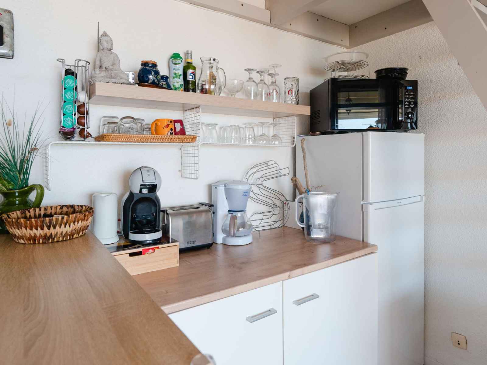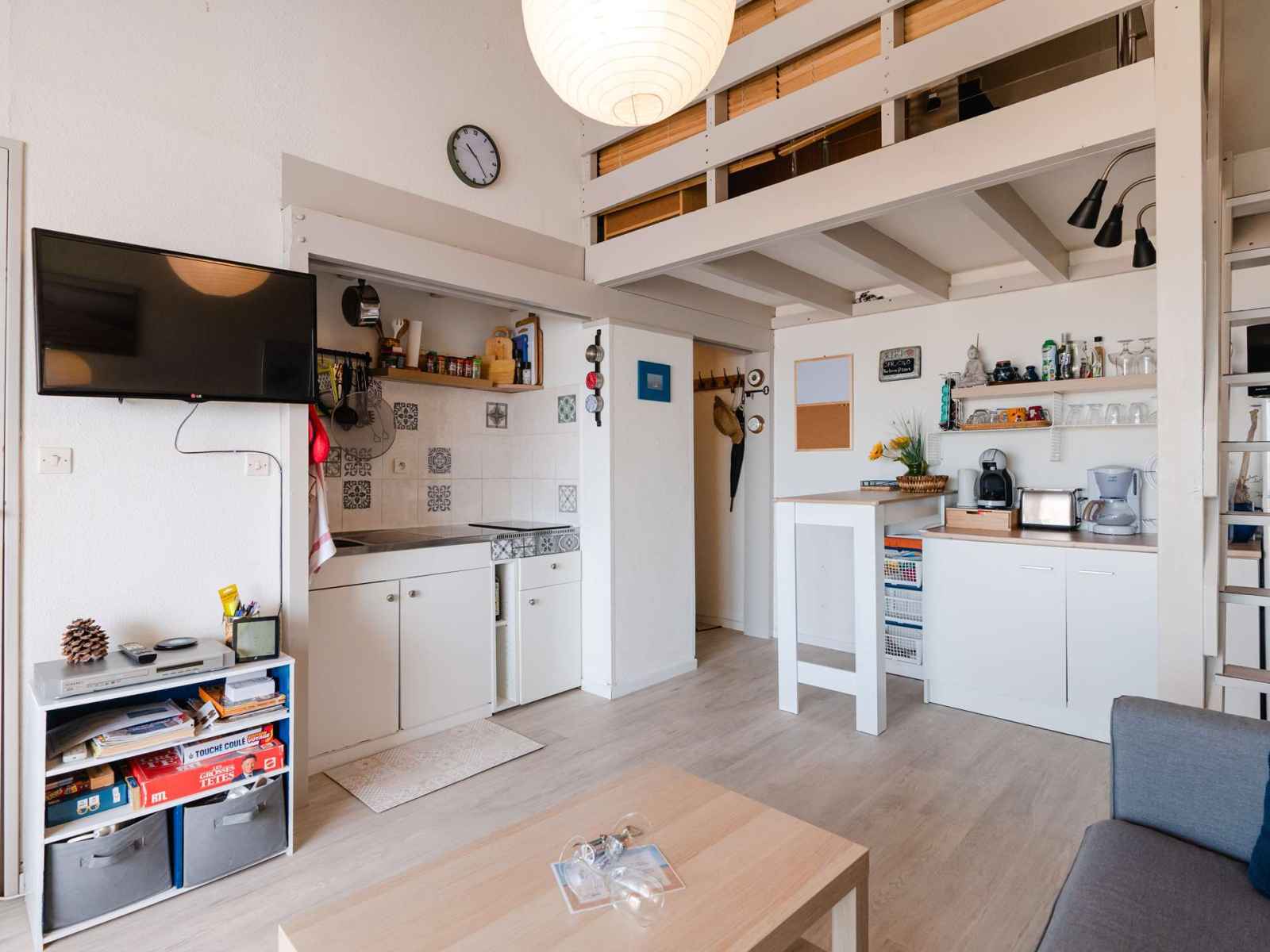 séjour avec canapé, TV (chaînes françaises + lecteur DVD), kitchenette avec 2 plaques vitro-céramique, 1 plaque amovible induction, réfrigérateur-congélateur, cafetière classique et à dosettes souples, grille-pain, bouilloire, mini-four combi micro-ondes, une chambre avec lit 140x190, une salle d'eau avec douche et WC séparés.