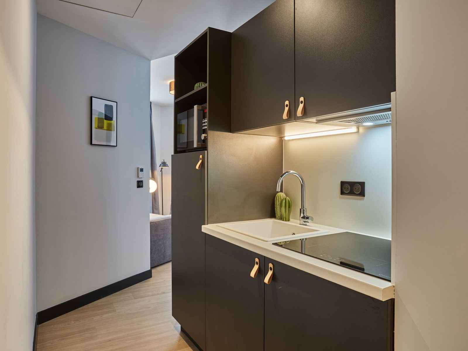 cuisine équipée (plaque électrique, hotte, réfrigérateur, micro-ondes grill, mini lave-vaisselle, bouilloire,)