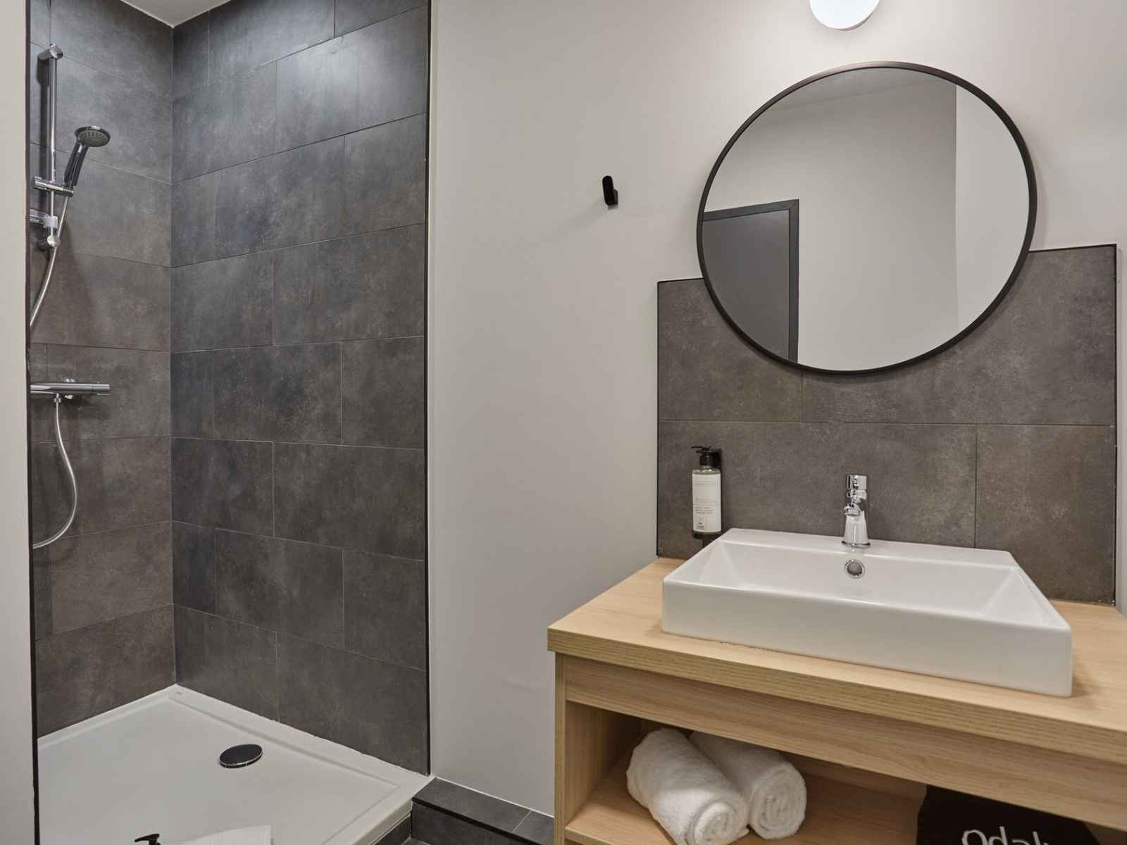 salle de bain avec douche, sèche-cheveux, sèche-serviettes