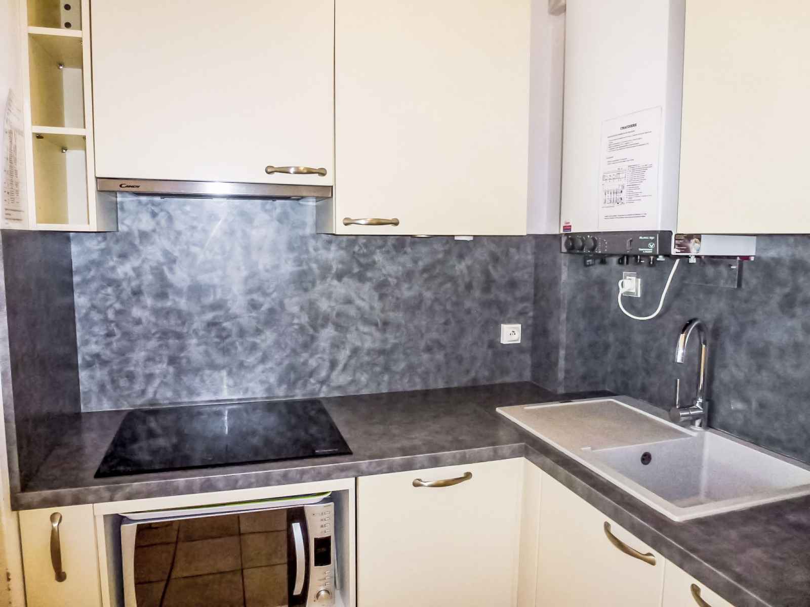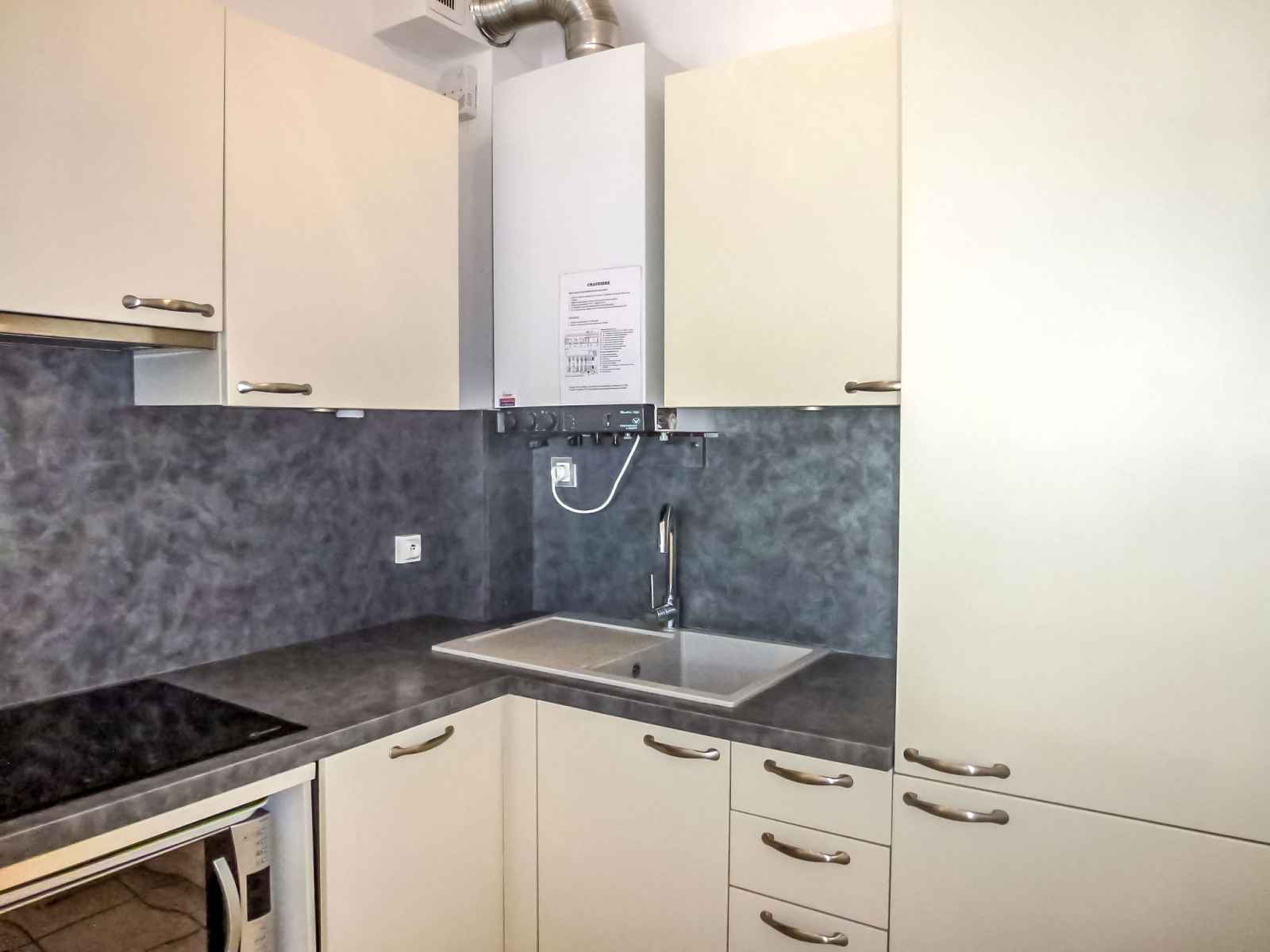 Apt 2 pièces 42 m2 sur 2 niveaux, au rez-de-chaussée. séjour/salle à manger avec 1 divan-lit double (140 cm, longueur 185 cm), tv. coin cuisine (lave-vaisselle, 3 plaques vitrocéramiques, congélateur, cafetière électrique, capsules pour machine à café (senseo) (non incluses)). wc séparé. À l'étage supérieur: 1 chambre avec 1
