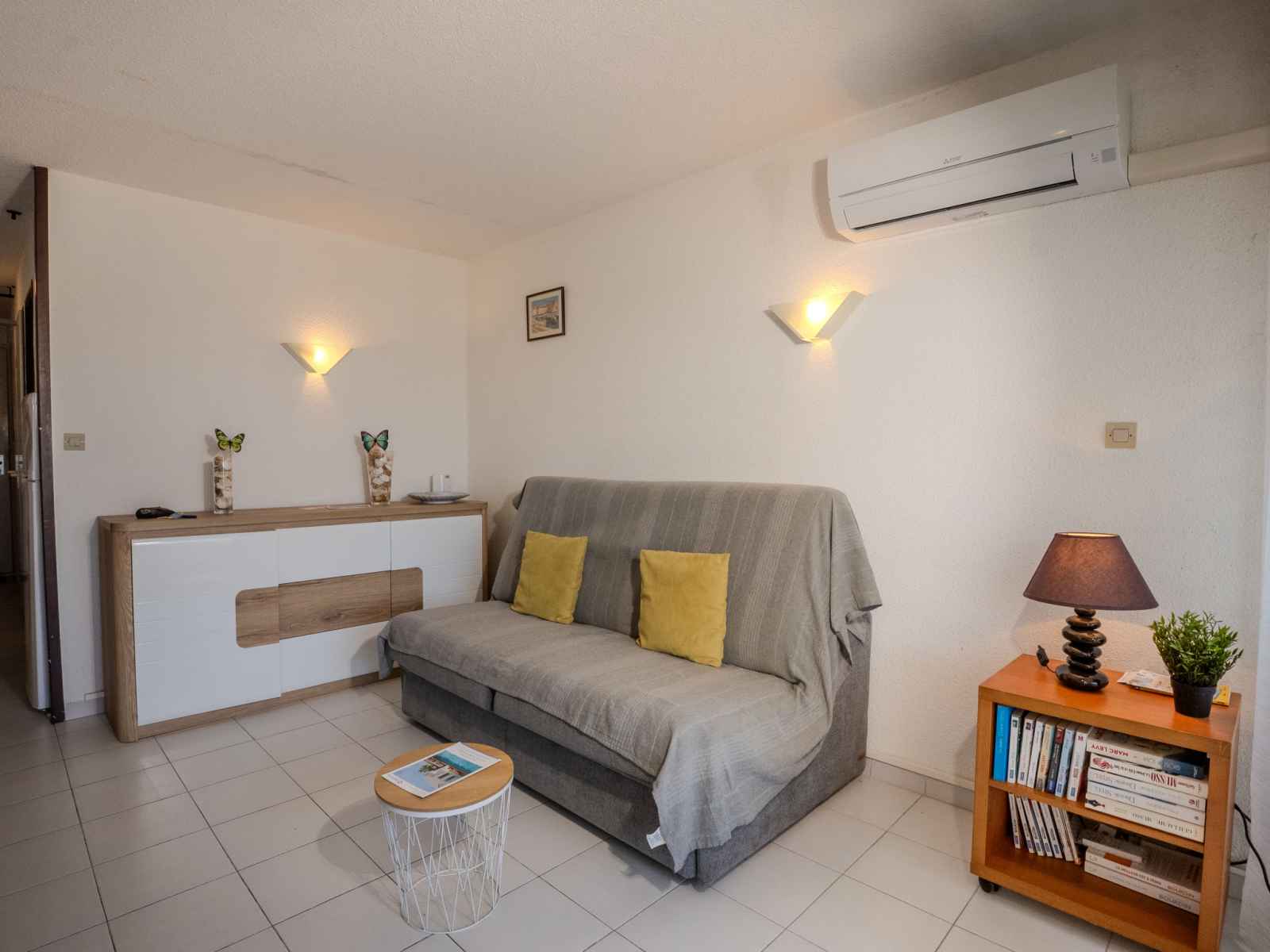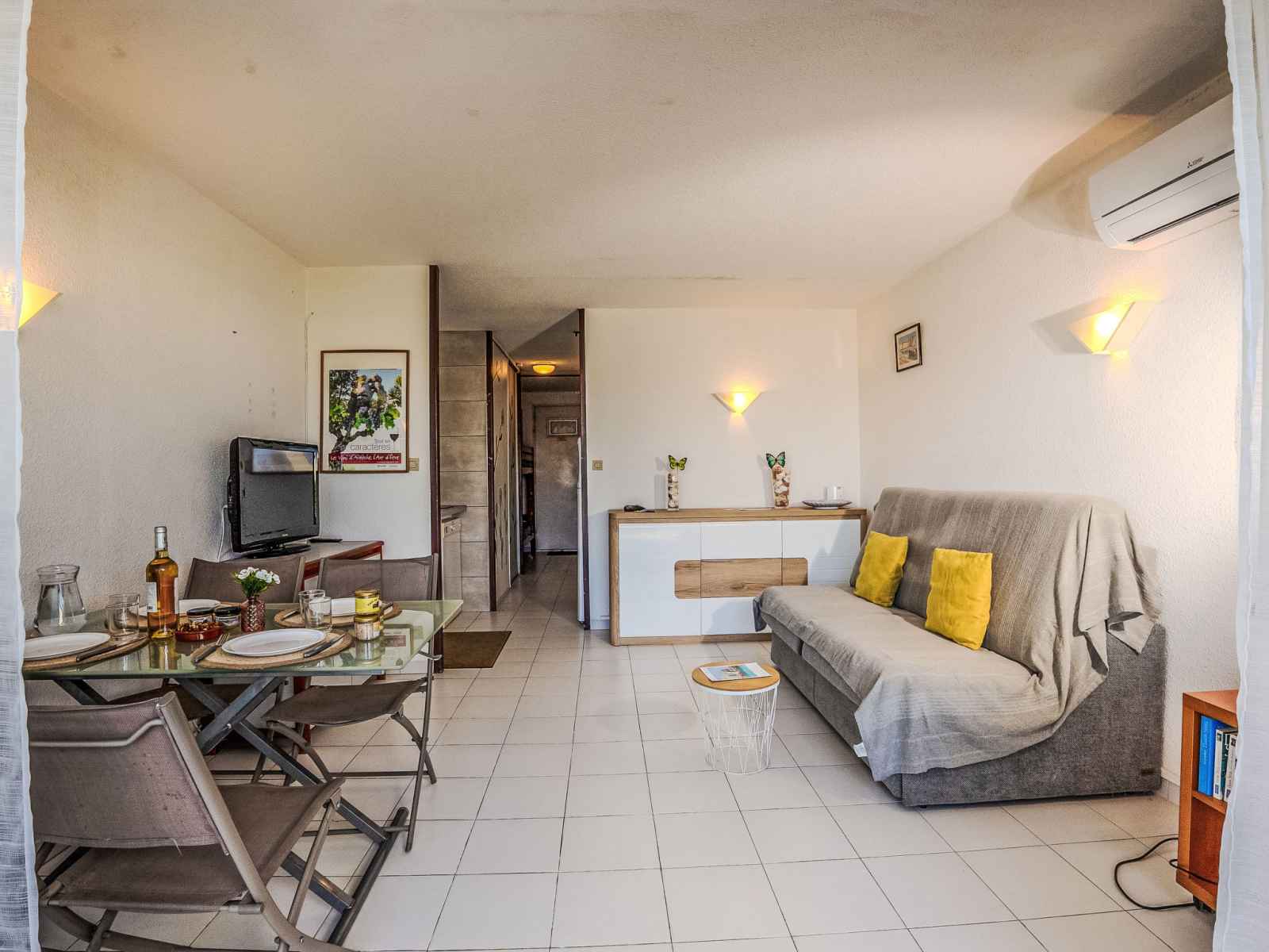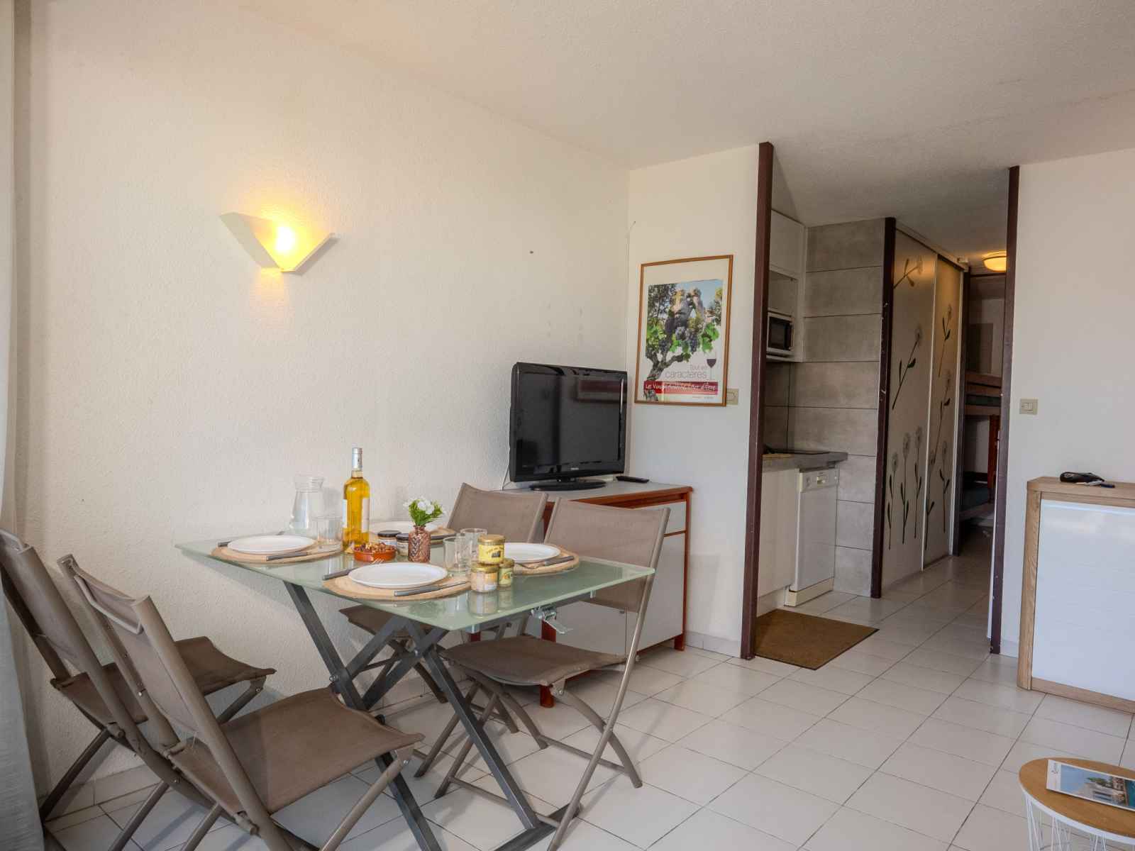 "les rivages d'ulysse", apt 2 pièces 33 m2, au rez-de-chaussée. logement idéal pour 2 adultes + 2 enfants. aménagement plaisant: séjour/salle à manger avec tv (écran plat). 1 petite chambre avec 1 grand-lit (140 cm, longueur 190 cm). entrée avec 2 lits (80 cm, longueur 190 cm). coin cuisine (four, lave-vaisselle, 2 plaques à induction,