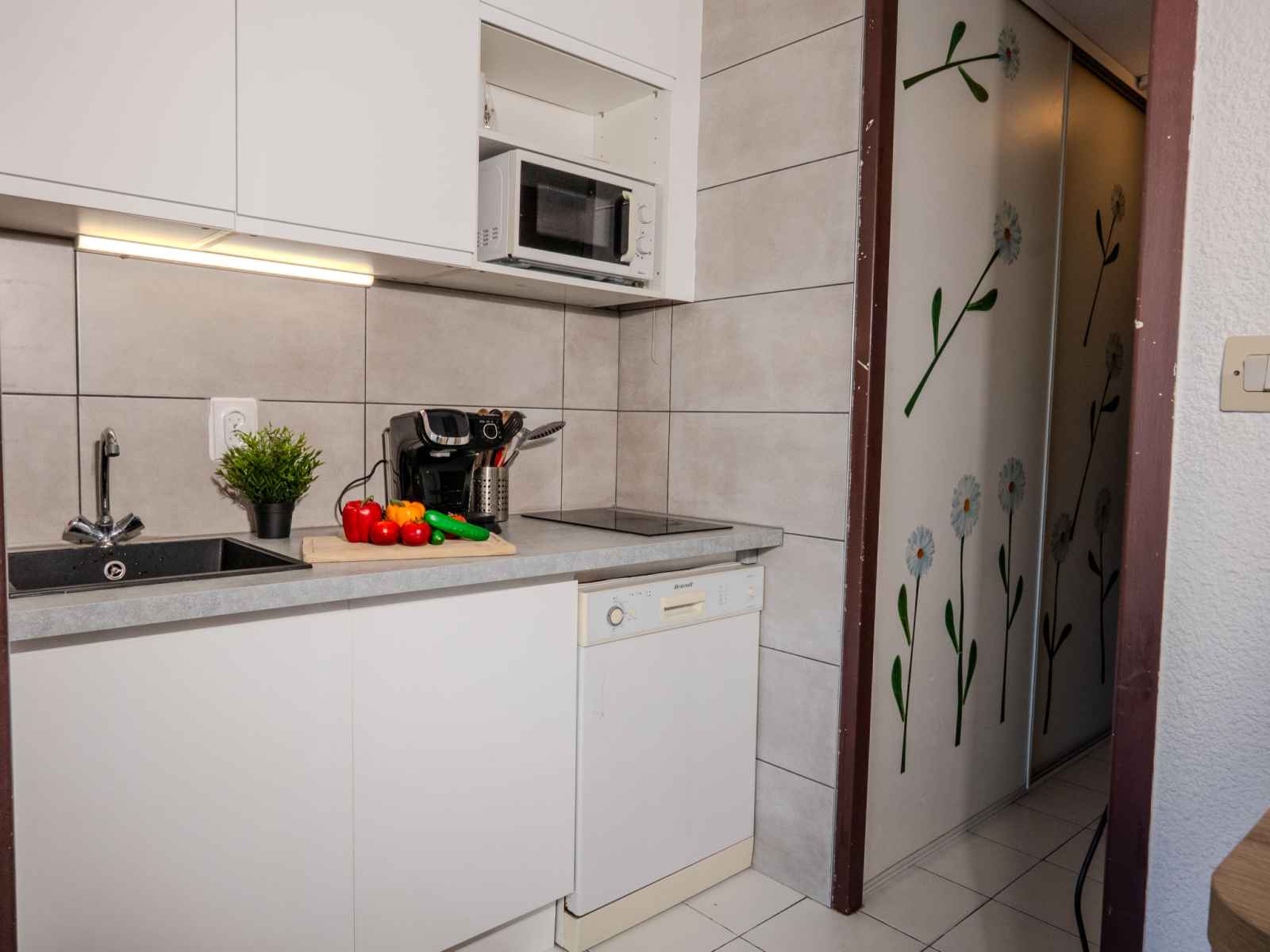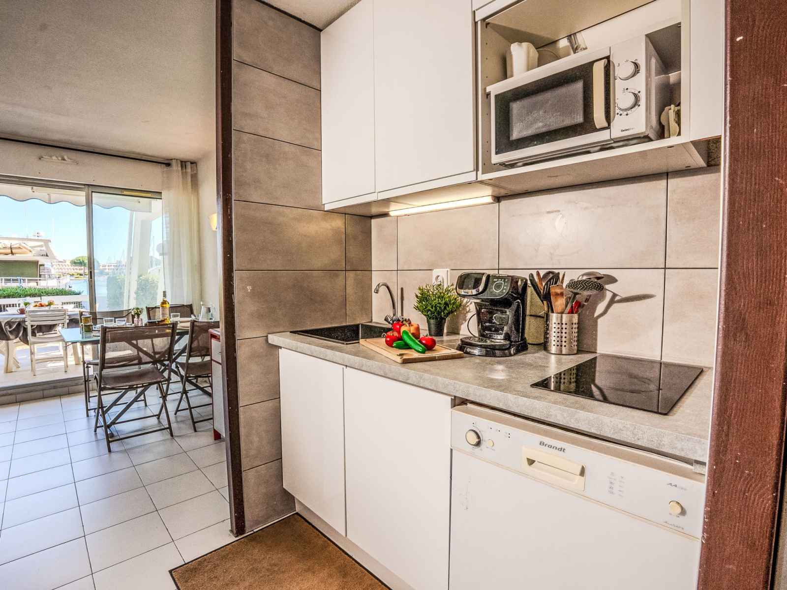 grille-pain, bouilloire électrique, micro-ondes, congélateur, cafetière électrique, Capsules pour machine à café (BOSCH) (NON INCLUSES)). Douche, WC séparé. Chauffage électrique, air-conditionné. Grande terrasse 15 m2, situation nord et situation est, jardinet 6 m2. Très belle vue sur le port. A disposition: lave-linge. Internet (Connexion WIFI, en sus). Place de parking No 12. Veuillez noter: maximum 1 animal/ chien autorisé. Détecteur de fumée. Annonce d'un particulier (art 155, IV du CGI). 301330010346R